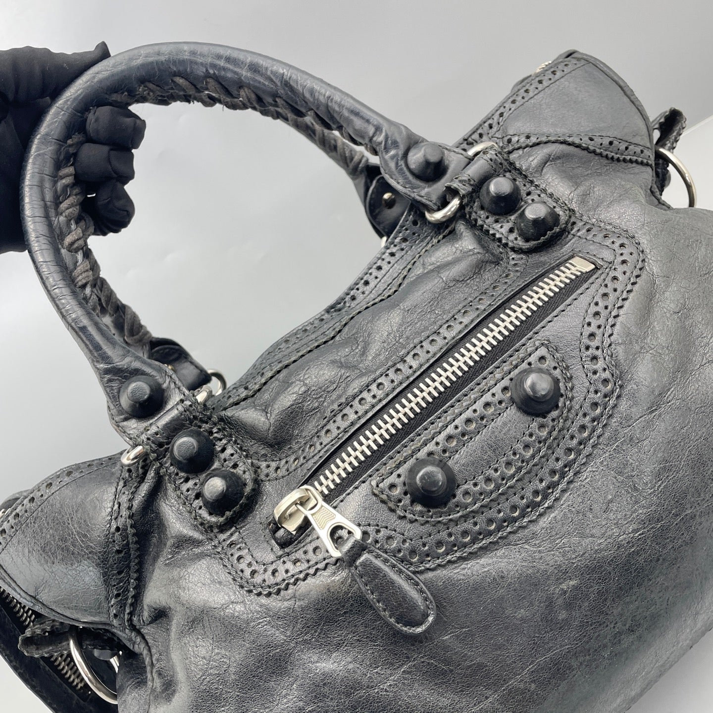 Crafted from supple, distressed black lambskin leather, this Balenciaga City bag features the brand's iconic 'Motorcycle' detailing. The front is adorned with a functional zip pocket, accentuated by a leather tassel pull, decorative buckles, and signature classic studs. Brogue-style perforations (镂空) enhance the leather trim around the front pocket, along the top zipper, and across the bottom panel of the bag, adding a distinctive textural element. Two braided top handles offer comfortable hand-carry, and side rings are present for an optional shoulder strap.