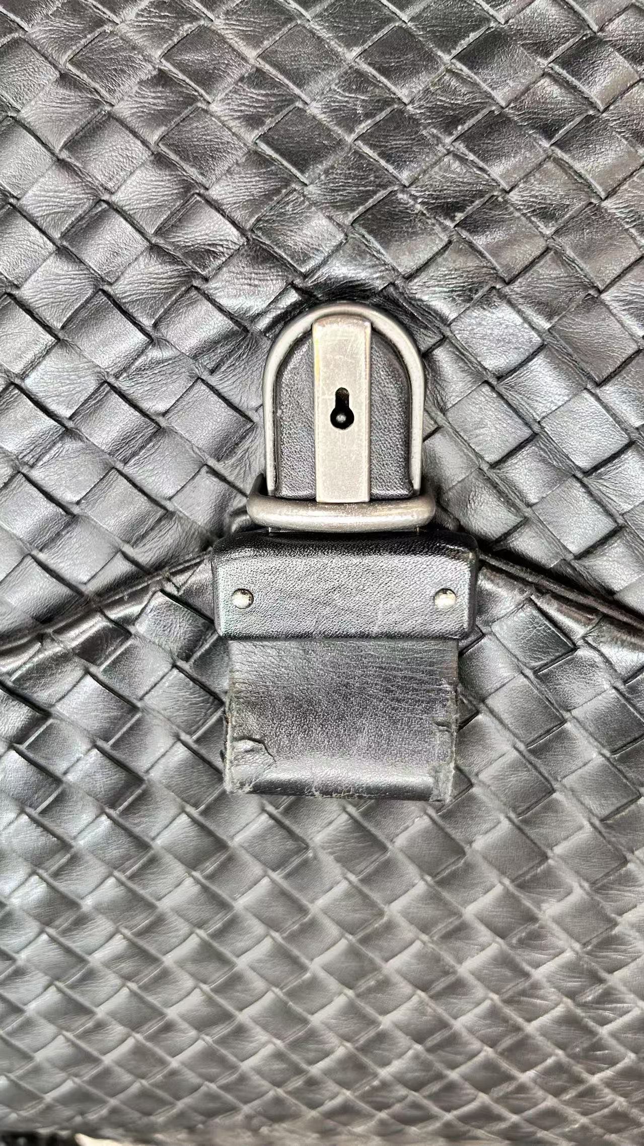 This Bottega Veneta Intrecciato Briefcase is in good pre-owned condition, showcasing the brand's iconic woven leather craftsmanship. The exterior leather retains much of its texture and overall structure, though subtle softening is present. Minor scuffing and slight loss of finish are visible on the bottom corners and edges, consistent with regular use. The metal hardware, including the flap lock, shows light surface scratches and some dulling. The interior lining is generally clean with some minor dust and light marks from prior use. The top handle remains sturdy and intact.