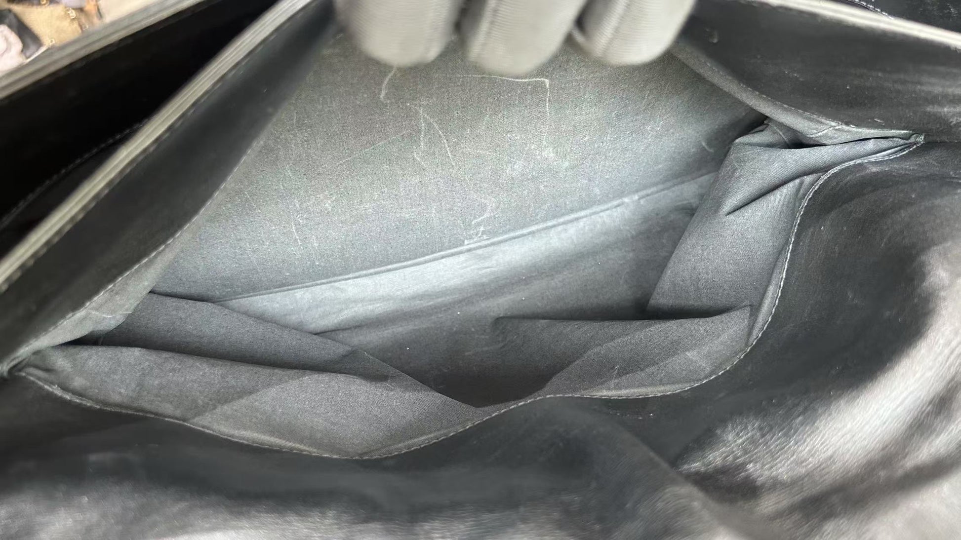 The interior is lined with a dark textile material, offering a spacious main compartment. It includes several slip pockets, suitable for organizing documents and essentials. The lining appears neat with minor signs of use, such as light dust and faint marks.