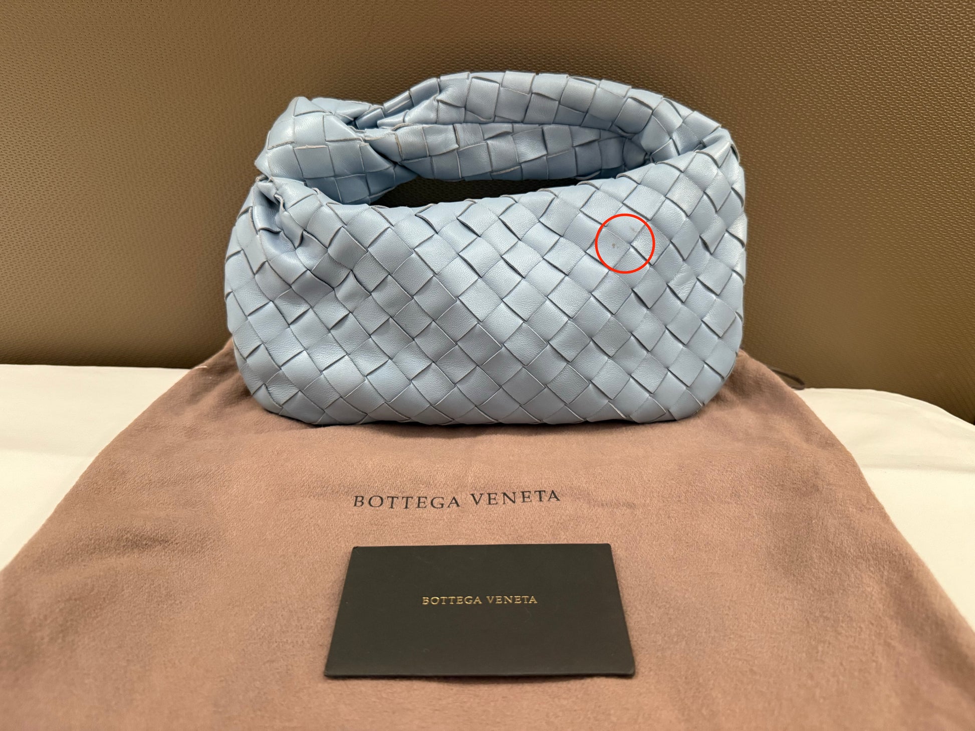 This Bottega Veneta Mini Jodie bag is in good pre-owned condition, featuring its iconic Intrecciato weave. The soft, slouchy structure is maintained. There is a visible small stain on the front of the bag, as noted. The interior shows minimal signs of use, and the zipper operates smoothly. The knotted handle retains its shape.