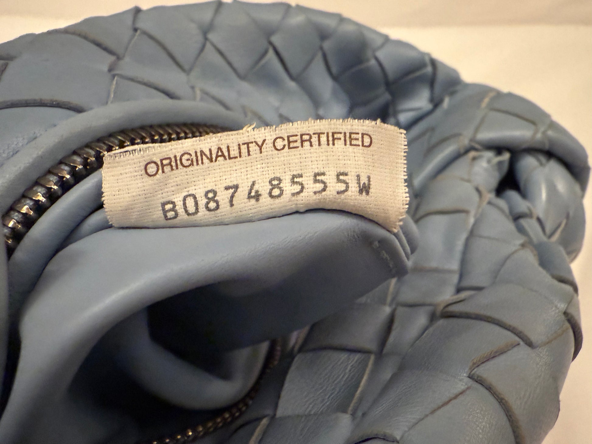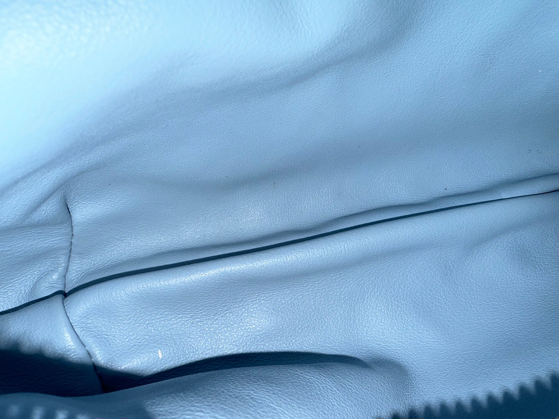 Crafted from supple lambskin leather in a delicate sky blue hue, showcasing Bottega Veneta's signature Intrecciato woven design throughout. The bag features a distinctive knotted detail on its integrated shoulder strap/handle. A small stain is visible on the front exterior of the bag.