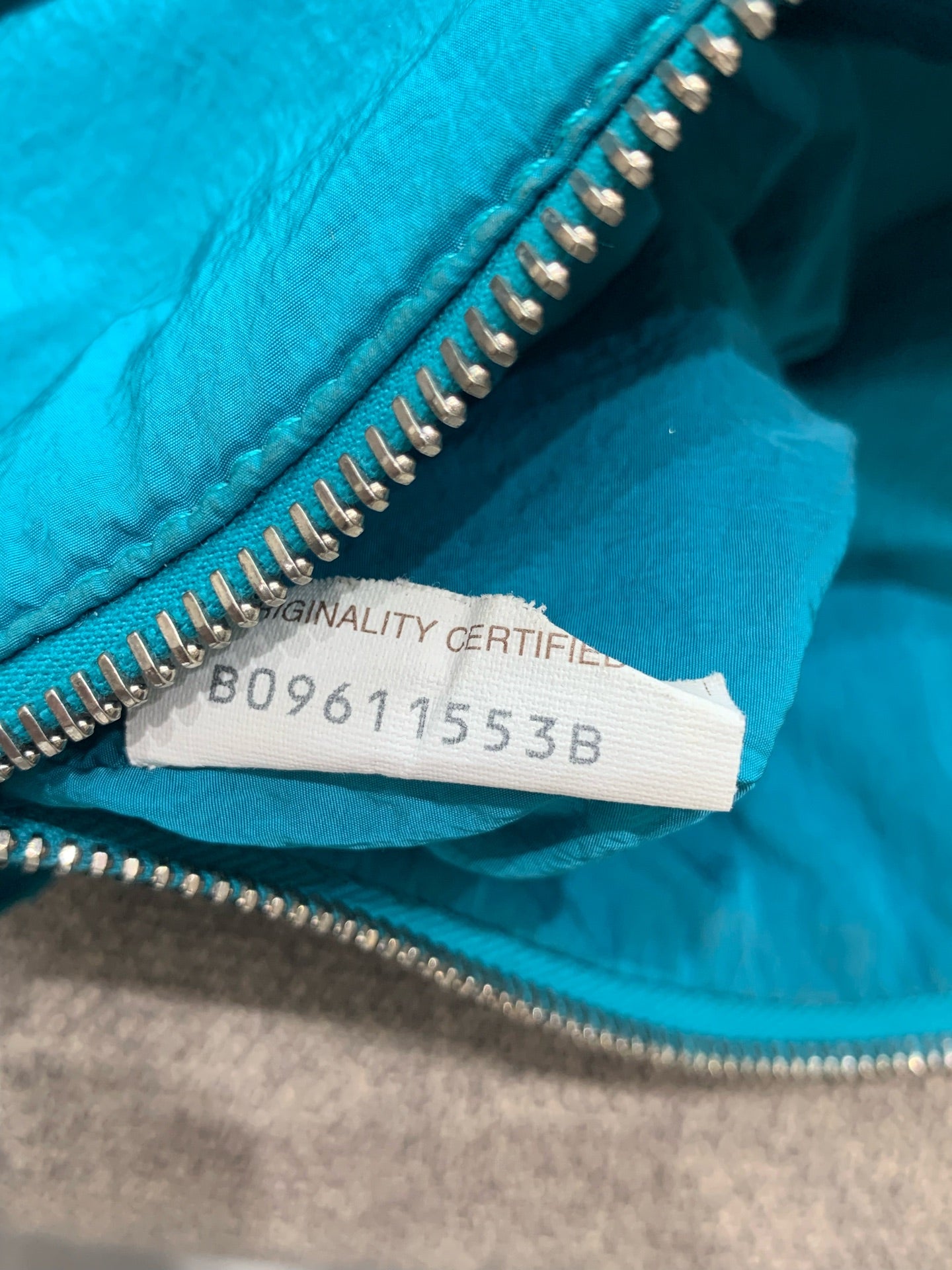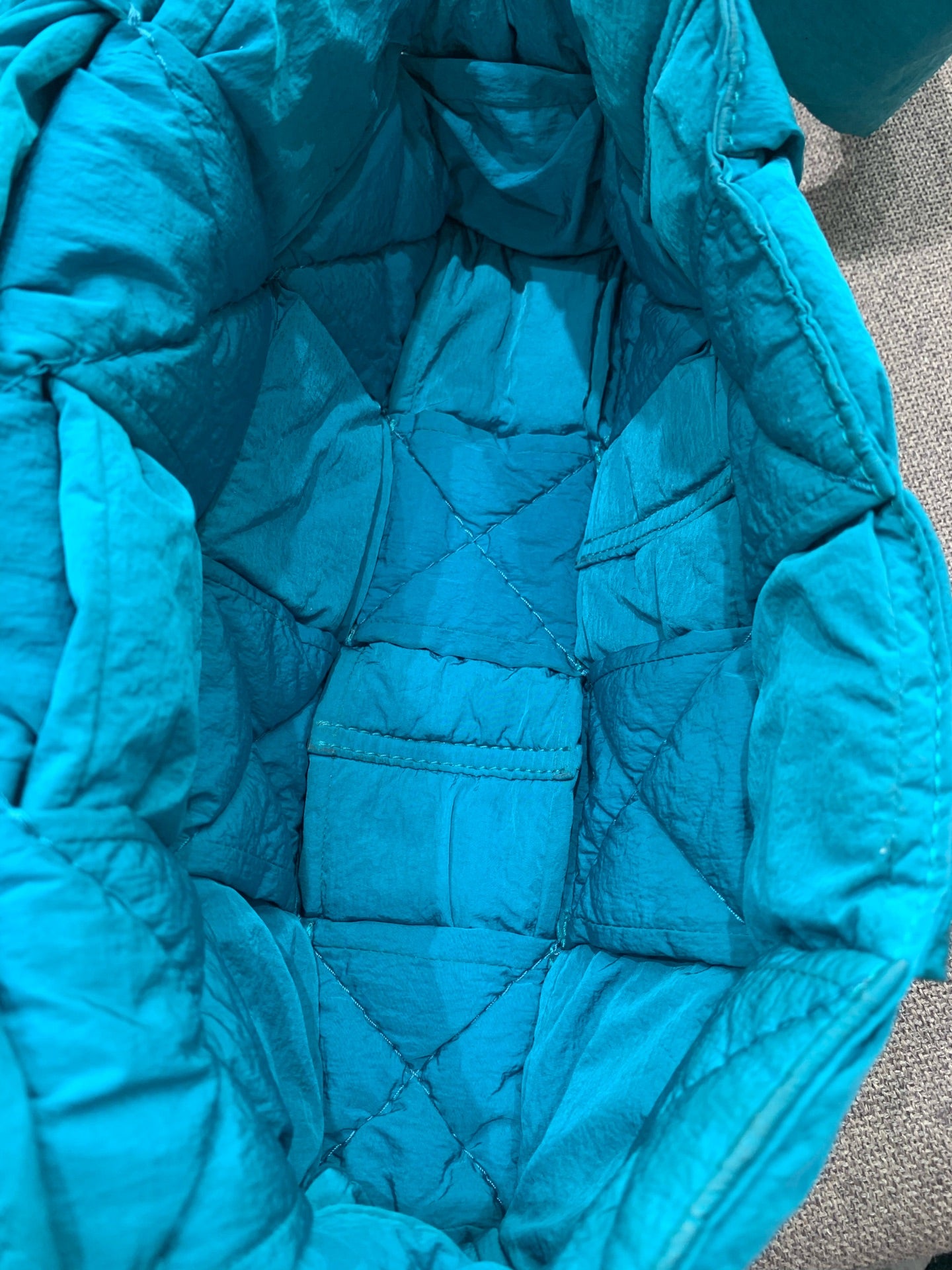 The interior compartment is lined with the same blue padded nylon, featuring a quilted pattern. It is spacious and well-maintained, ideal for daily essentials. A fabric authenticity tag with a serial number is present inside.
