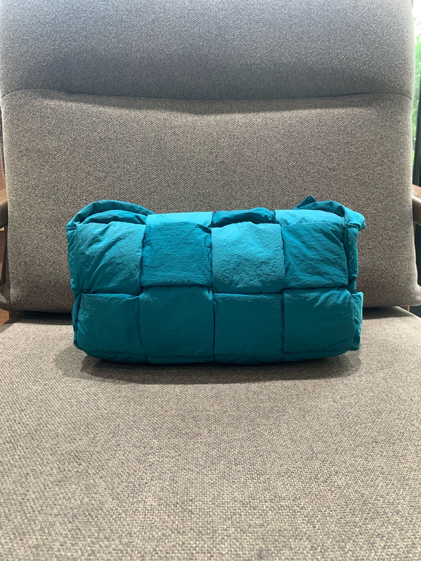 The exterior is crafted from a durable, padded technical nylon fabric in a striking blue hue. It features Bottega Veneta's signature Intreccio weave, rendered in a puffy, 'pillow-like' style. The structural padding gives the bag a soft yet defined silhouette. An adjustable shoulder strap, made from the same blue nylon, allows for comfortable wear as a shoulder or crossbody bag.