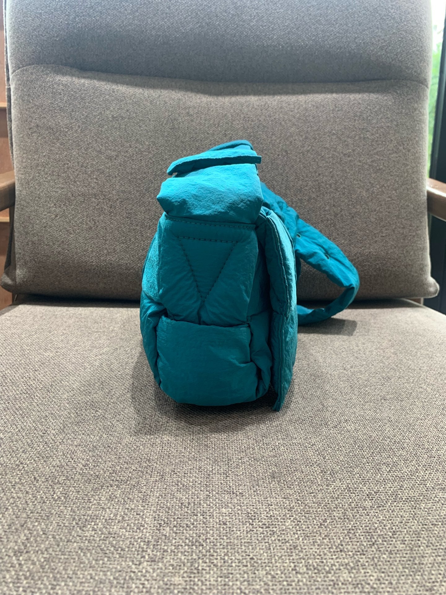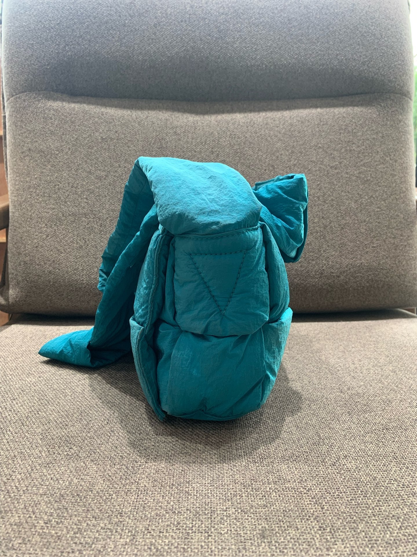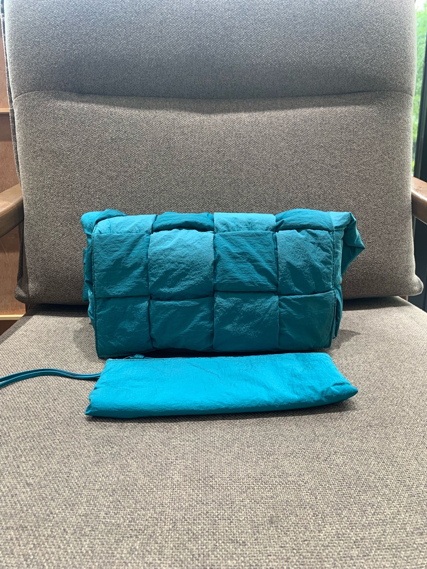 A standout piece from Bottega Veneta, known for its distinctive padded Intreccio design. The tech fabric provides a contemporary and practical appeal, while the 'pillow' effect adds a luxurious and comfortable feel. The adjustable strap enhances its versatility for various styling options.