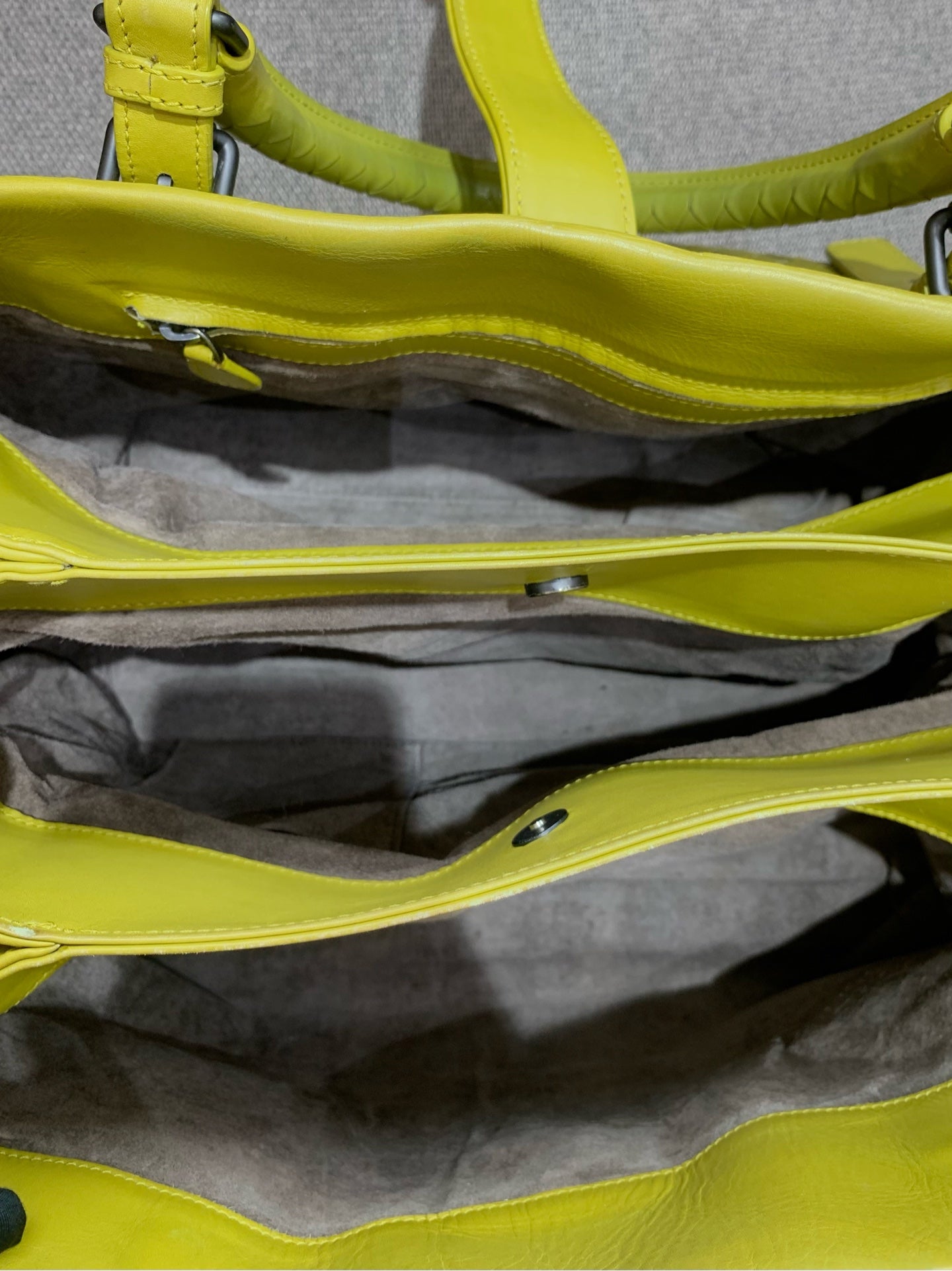 This Bottega Veneta Roma bag is in very good pre-owned condition, reflecting an overall '97 new' assessment. The vibrant lime yellow Intrecciato woven cowhide exterior maintains its structured silhouette with minimal signs of wear. The distinctive weave is intact, and the leather remains supple. The dark gunmetal-tone hardware is bright with only faint surface marks, and the clasp mechanism functions smoothly. The interior compartments are clean and well-maintained.