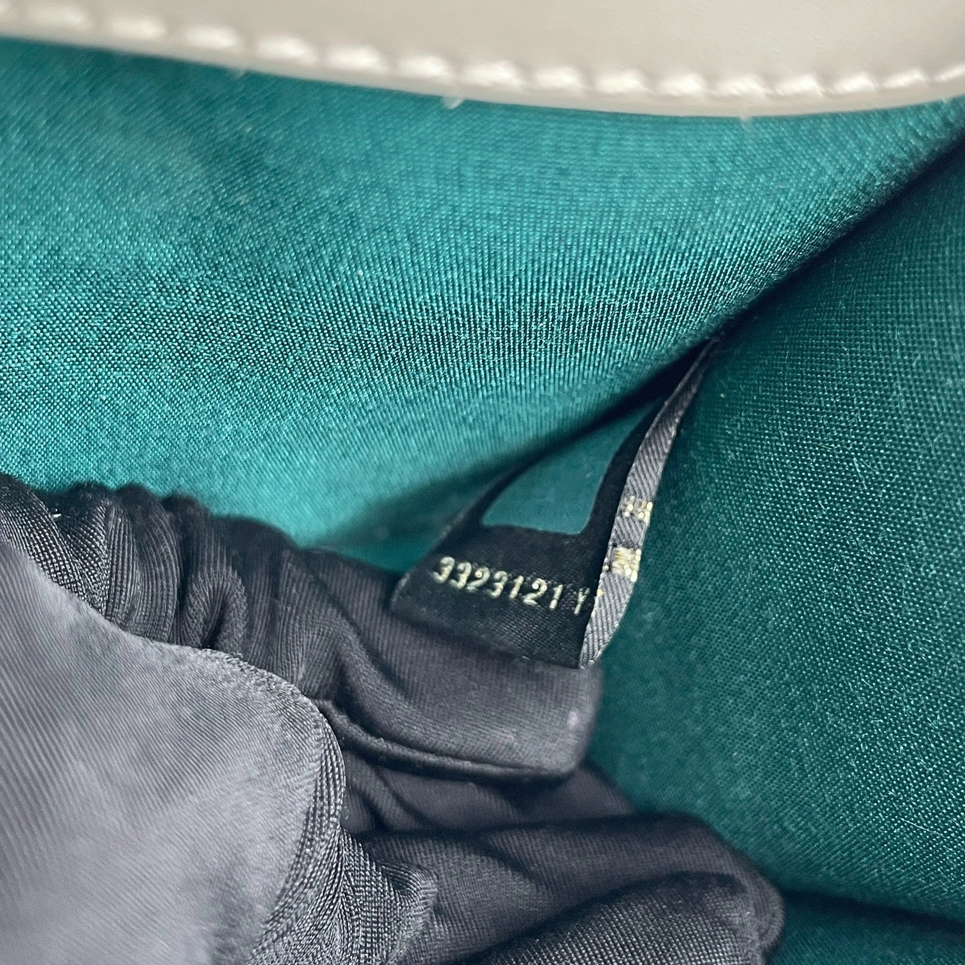 The standout feature is the unique Serpenti head closure, an emblem of Bvlgari's heritage and design prowess. The contrast between the smooth white leather exterior and the rich teal interior, along with the black and white enamel snakehead with green accents, creates a luxurious and distinct aesthetic.