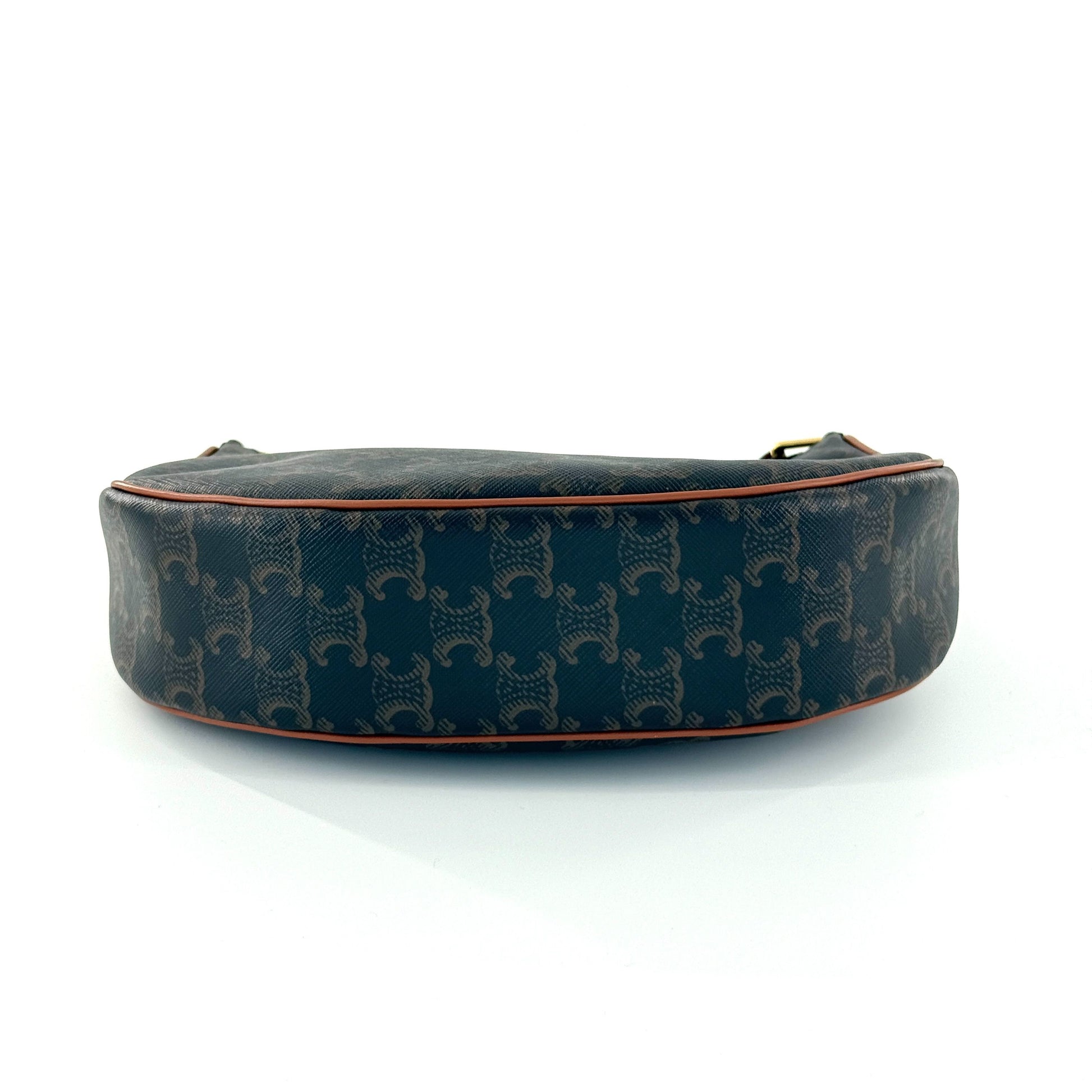 Crafted from Celine's iconic Triomphe canvas featuring a repeating monogram pattern in shades of brown. The elegant crescent shape is complemented by smooth brown leather piping along the edges and a matching adjustable leather shoulder strap. The top closure is secured with a zipper, providing easy access to the interior.