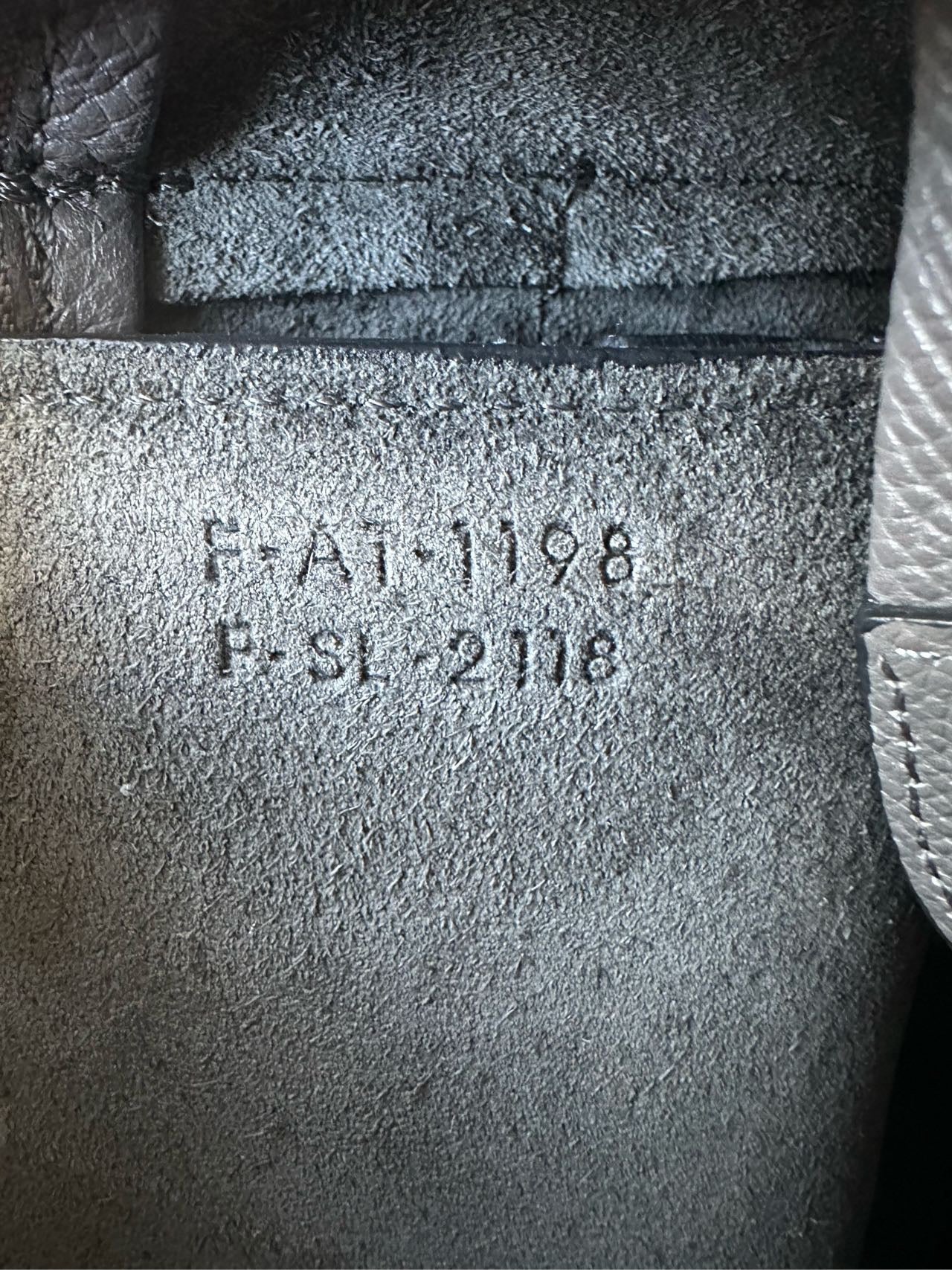 Crafted from luxurious deep grey grained calfskin leather, the bag features Celine's iconic trapezoidal silhouette with expandable winged sides. The front flap is secured by the distinctive 'belt' strap and a metallic tuck lock closure. A top handle offers elegant hand-carry, complemented by a discreet exterior zip pocket on the back.