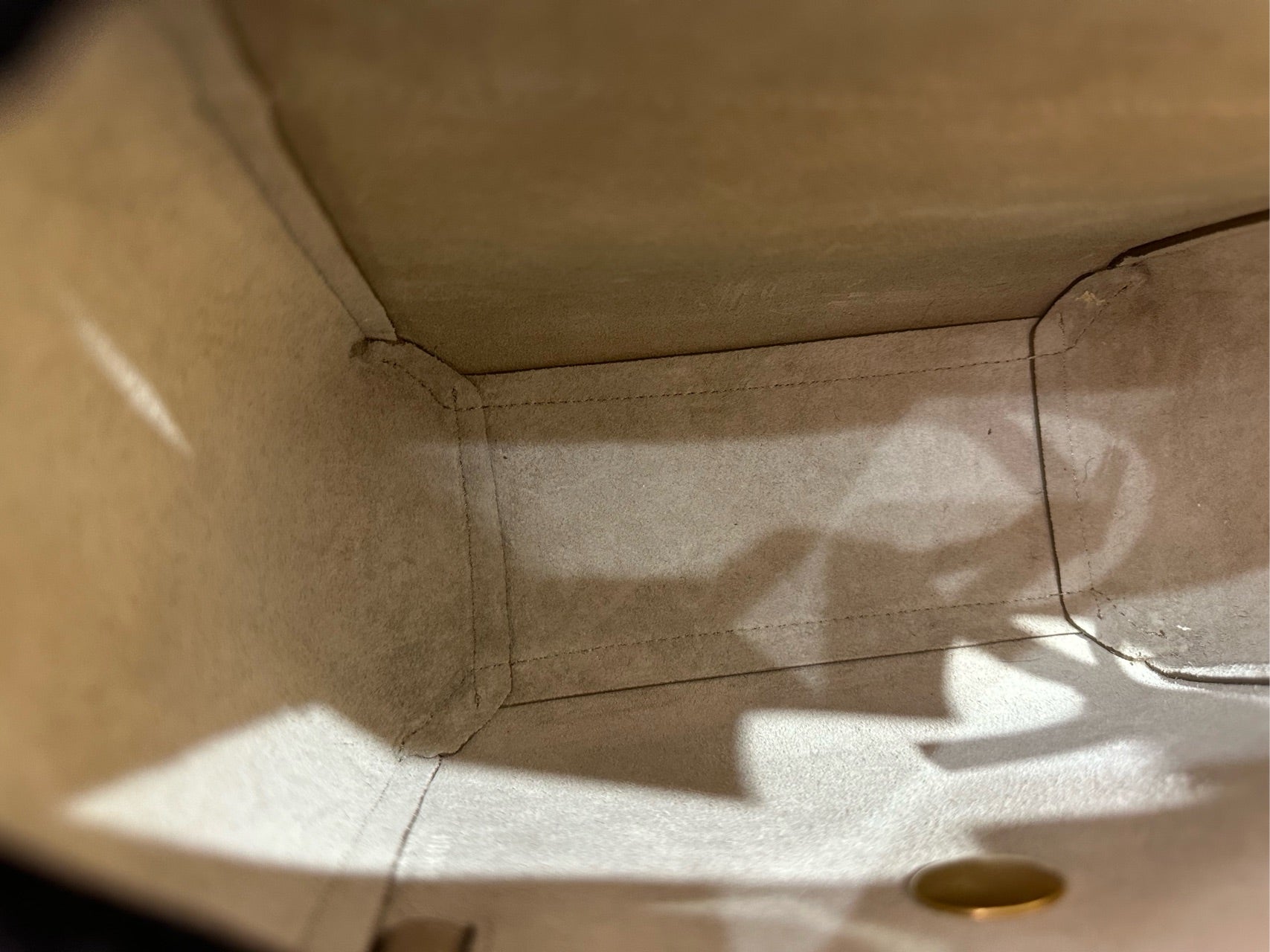 The interior is lined with a soft, matching suede-like material, offering a luxurious feel. It consists of a single main compartment, which is spacious enough for daily essentials. The lining is clean and free of any marks or damage.