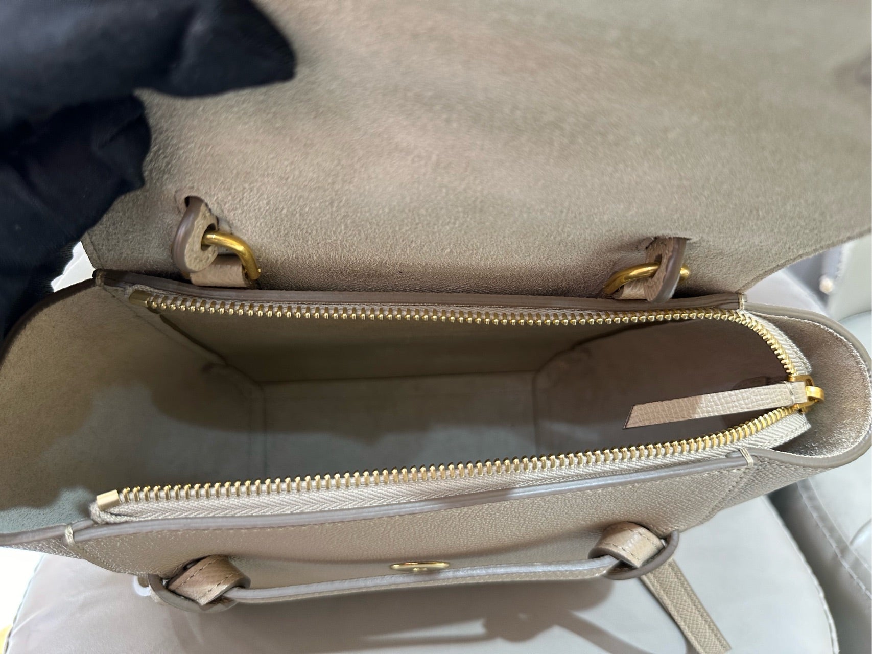 This Celine Belt Nano bag is in unused, new-old-stock condition, showing virtually no signs of wear. The grained calfskin exterior is immaculate, retaining its original structure and texture. All edges and corners are pristine. The gold-tone hardware, including the magnetic snap closure and zipper, is bright and functional with no visible scratches or tarnishing. The interior is clean and free of marks. The adjustable shoulder strap is in excellent condition, ready for versatile styling.