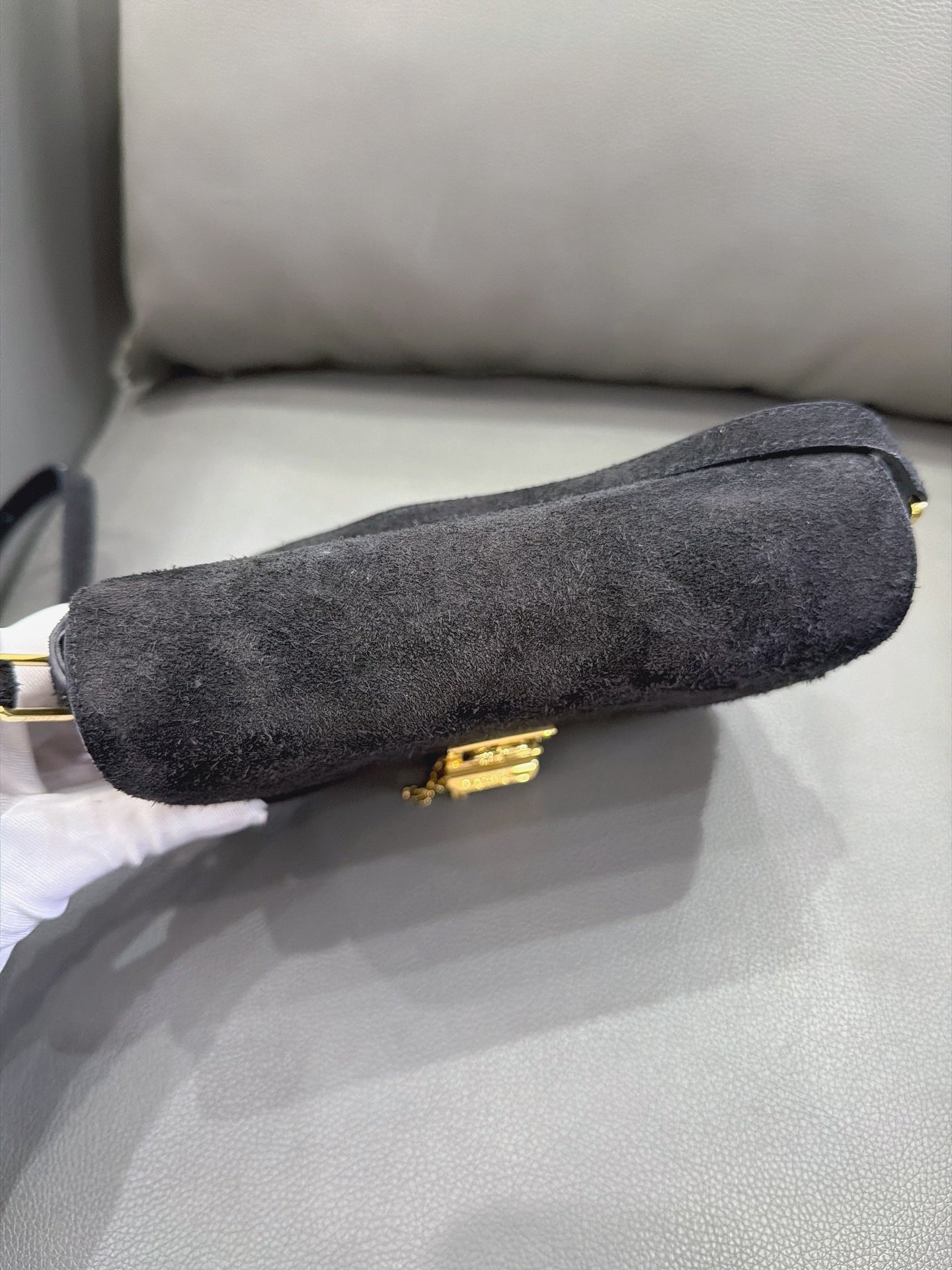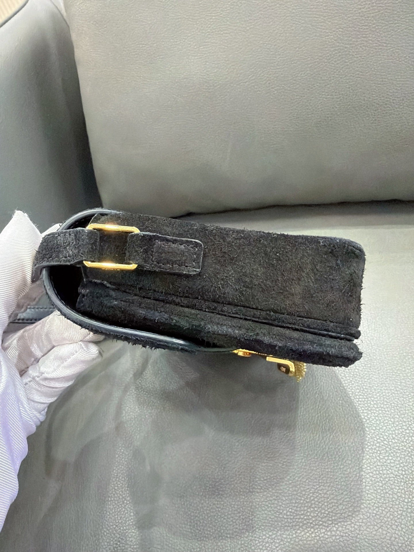 Crafted from luxurious black suede, the bag features a structured rectangular silhouette with a curved flap closure. The suede surface is generally well-preserved, showcasing its characteristic soft texture. The edges and corners are intact with minimal rubbing.