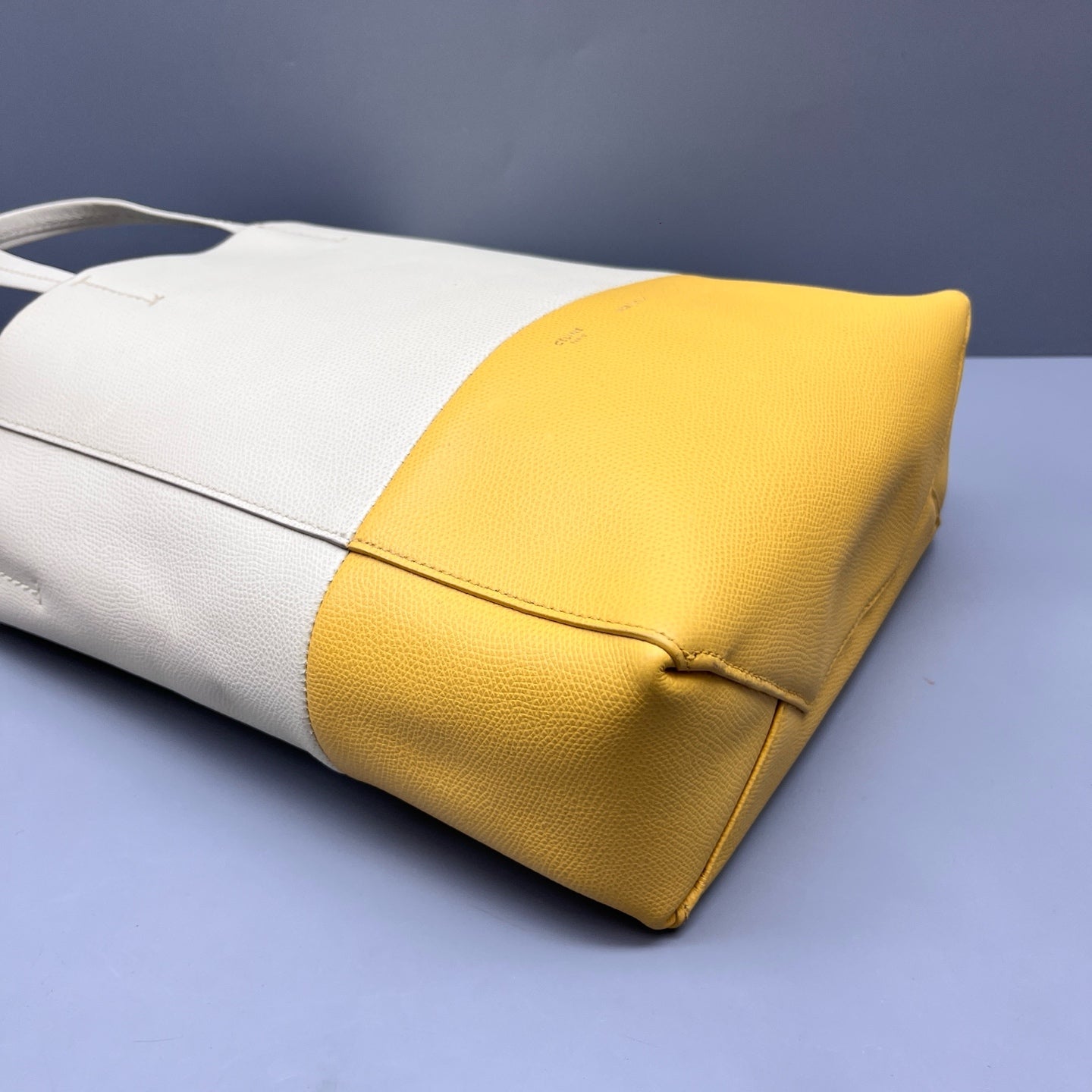 Crafted from a luxurious combination of cream and yellow grained calfskin leather, presenting a chic colorblock design. The front features the subtly debossed 'CELINE PARIS MADE IN ITALY' logo on the yellow section. The bag maintains a structured, upright silhouette. It is equipped with two sturdy top handles for hand carrying and a slender, adjustable, and detachable strap for shoulder or crossbody wear.