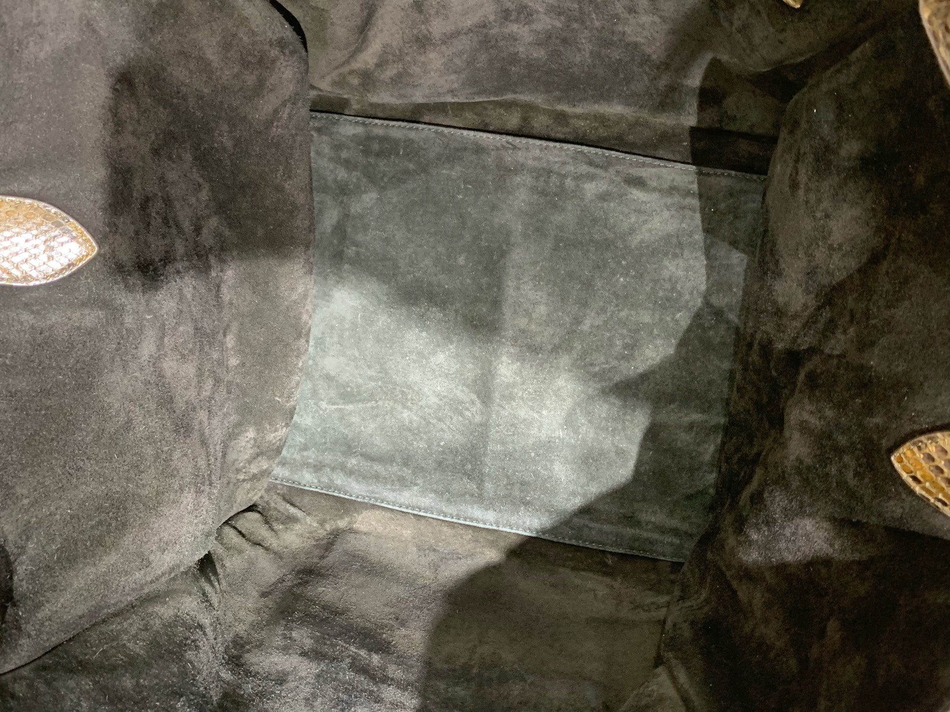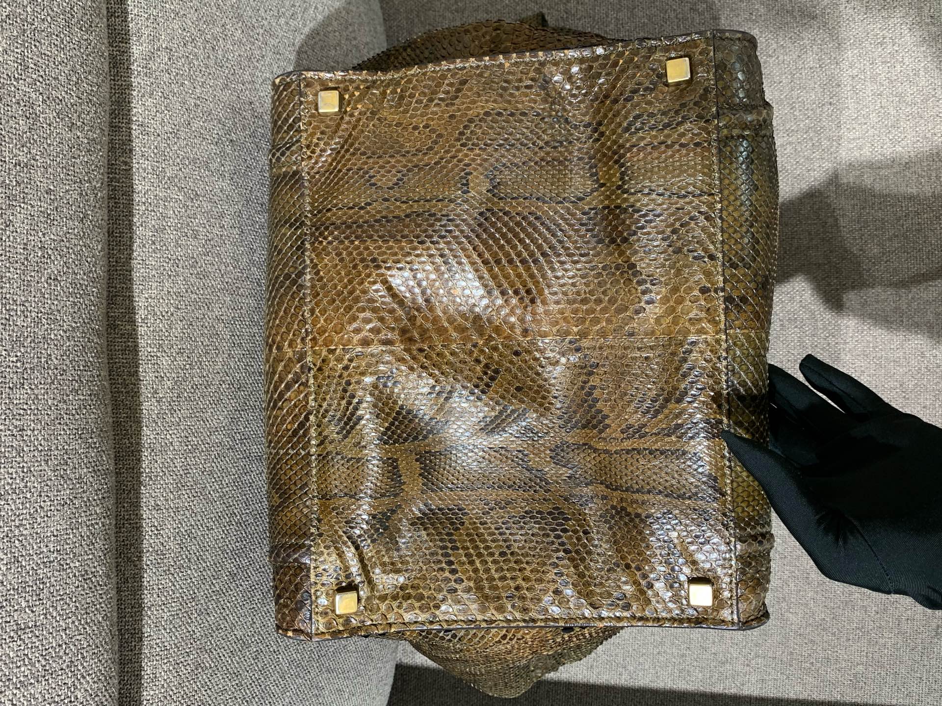 This Celine Phantom Tote Bag in exotic python leather is in very good pre-owned condition. The unique brown and green python skin maintains its rich texture and color variation, with scales largely intact and minimal lifting. The overall structure of the bag is well-preserved, showcasing its iconic winged silhouette. The rolled python handles show slight darkening and natural wear consistent with gentle use, but remain sturdy. The interior suede lining is clean with minor signs of use. All hardware appears functional and in good condition, with only superficial signs of wear.