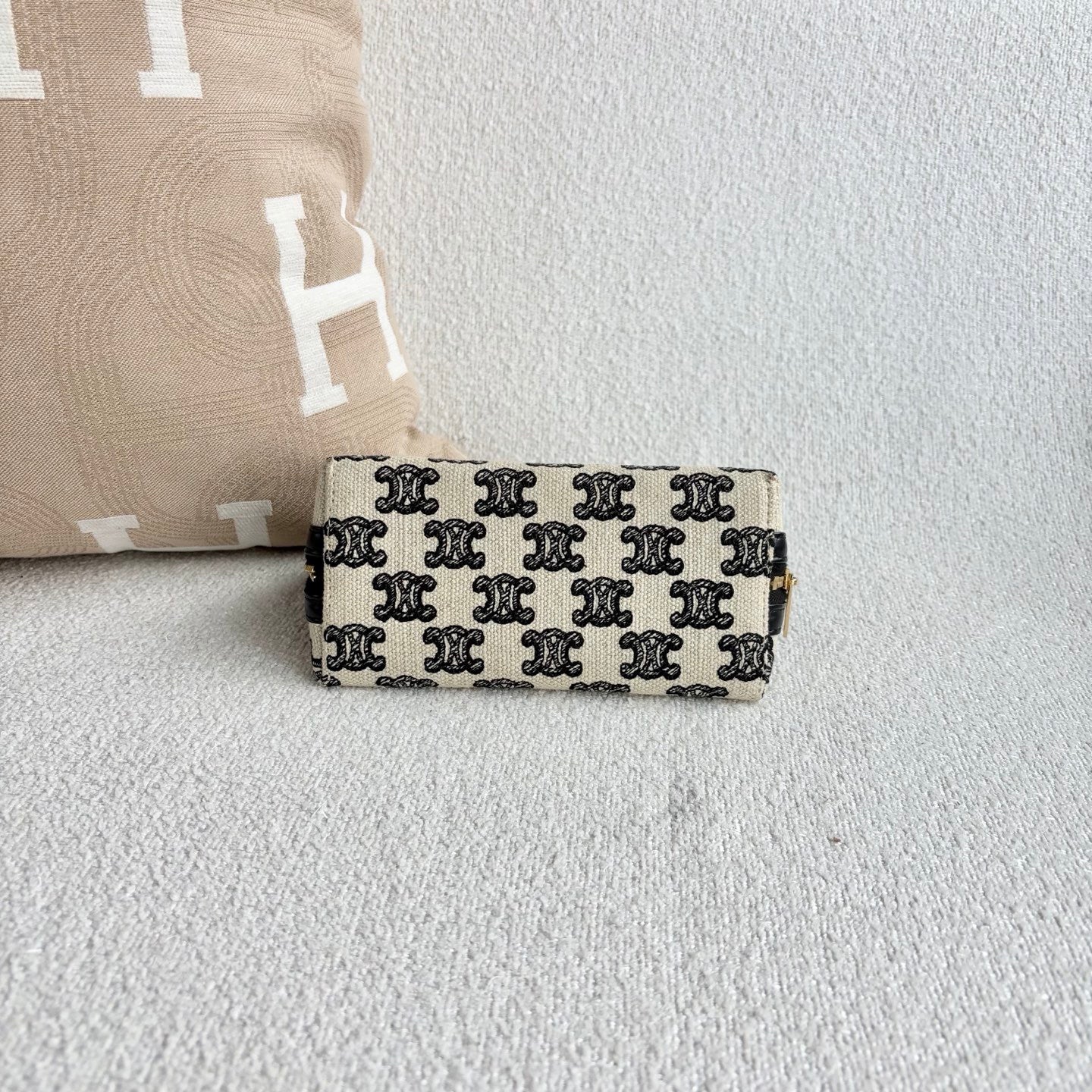The exterior features a beige/cream canvas base beautifully embroidered with the iconic Celine Triomphe monogram in black. The embroidery is crisp and intact, providing a textured finish. The bag is neatly trimmed with smooth black leather along the top edges, sides, and zipper pull. Its structured, rectangular silhouette with slightly rounded corners gives it a chic and compact appearance.