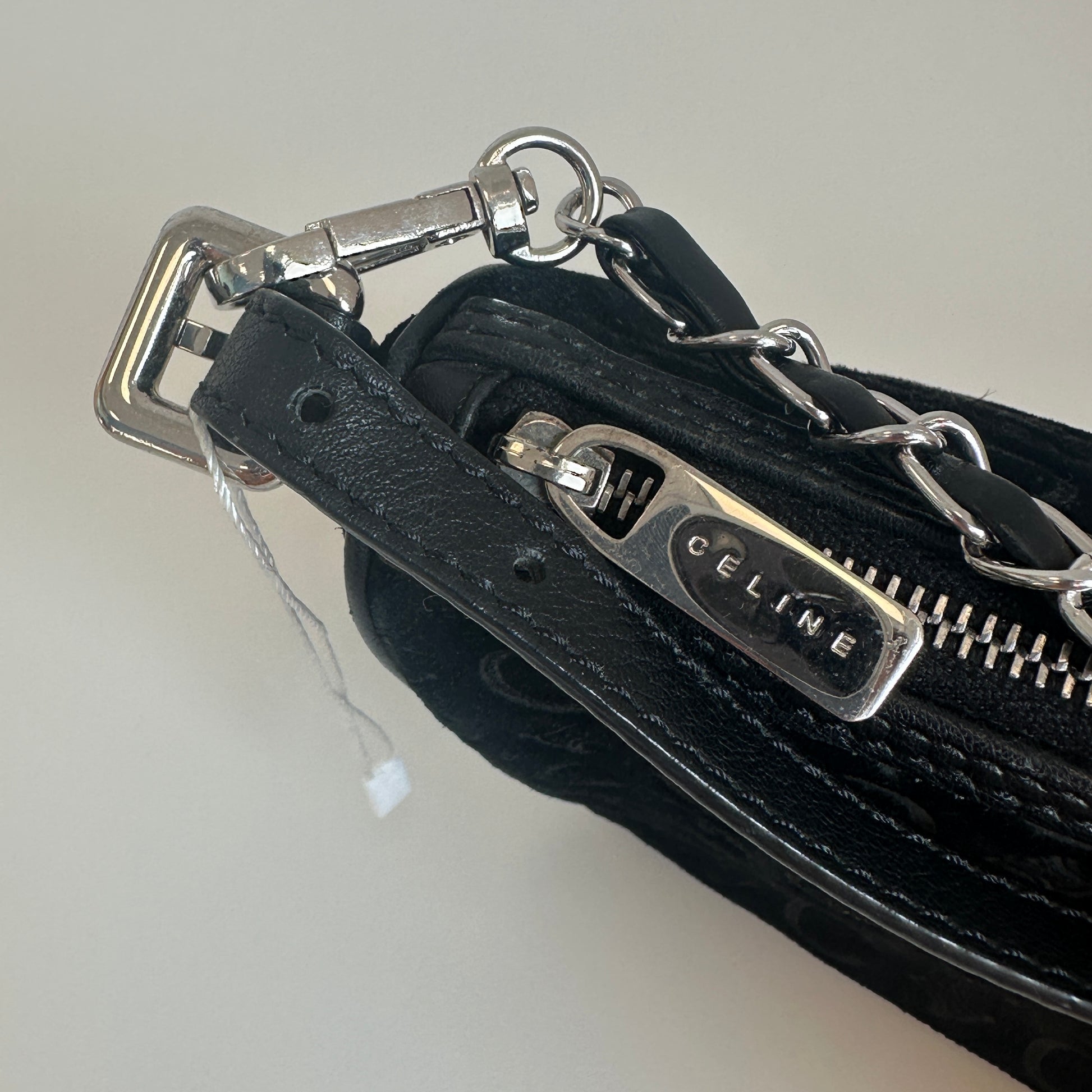 All hardware is silver-tone metal, including the zipper, strap clasps, and any embellishments. The main zipper pull is engraved with 'CELINE' and functions smoothly. The strap clips are sturdy and show only minor surface wear, contributing to the bag's sleek aesthetic.