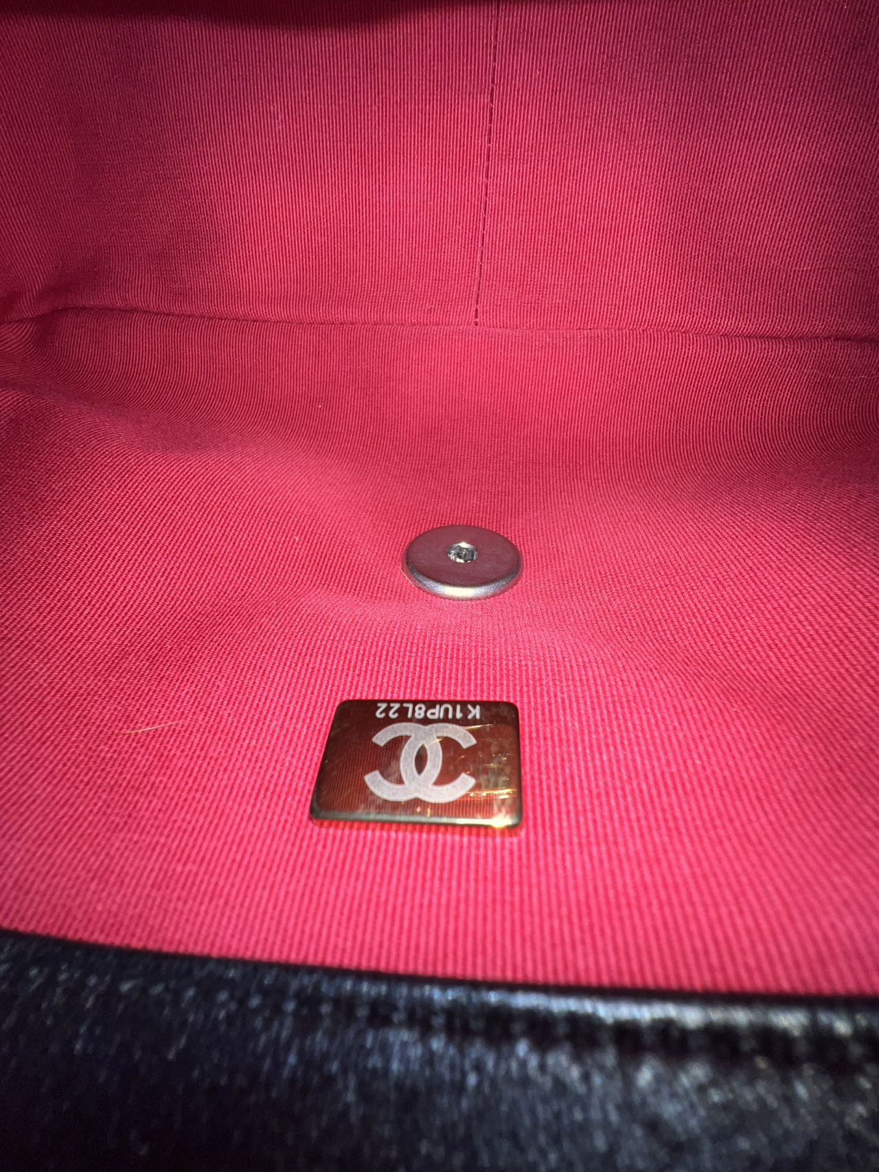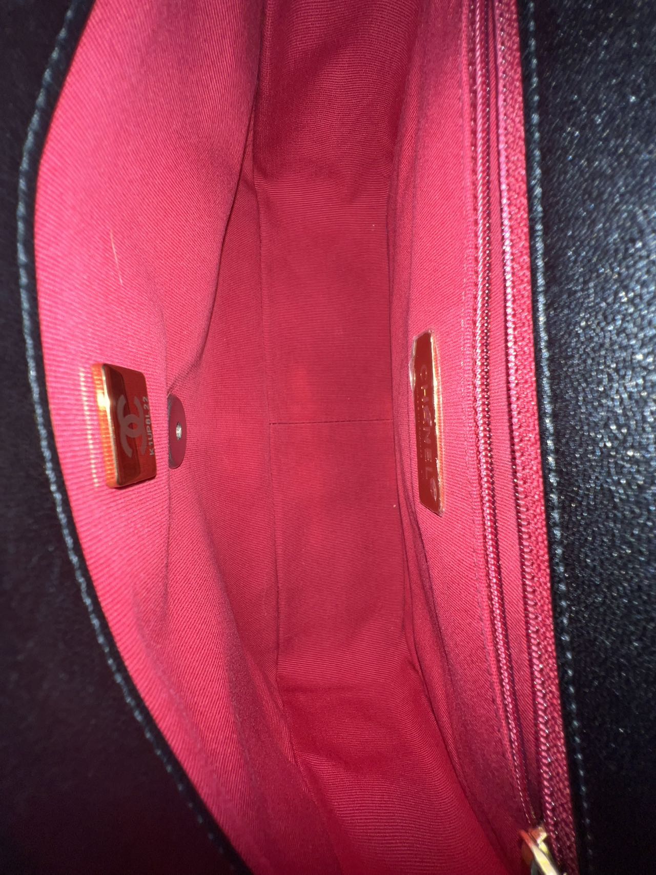 The interior is lined with a vibrant red fabric, offering a striking contrast to the black exterior. It features a main compartment with a flat slip pocket and a zipped pocket on the inner wall, providing practical storage. An internal gold-tone Chanel plaque and a microchip authenticity tag are present.