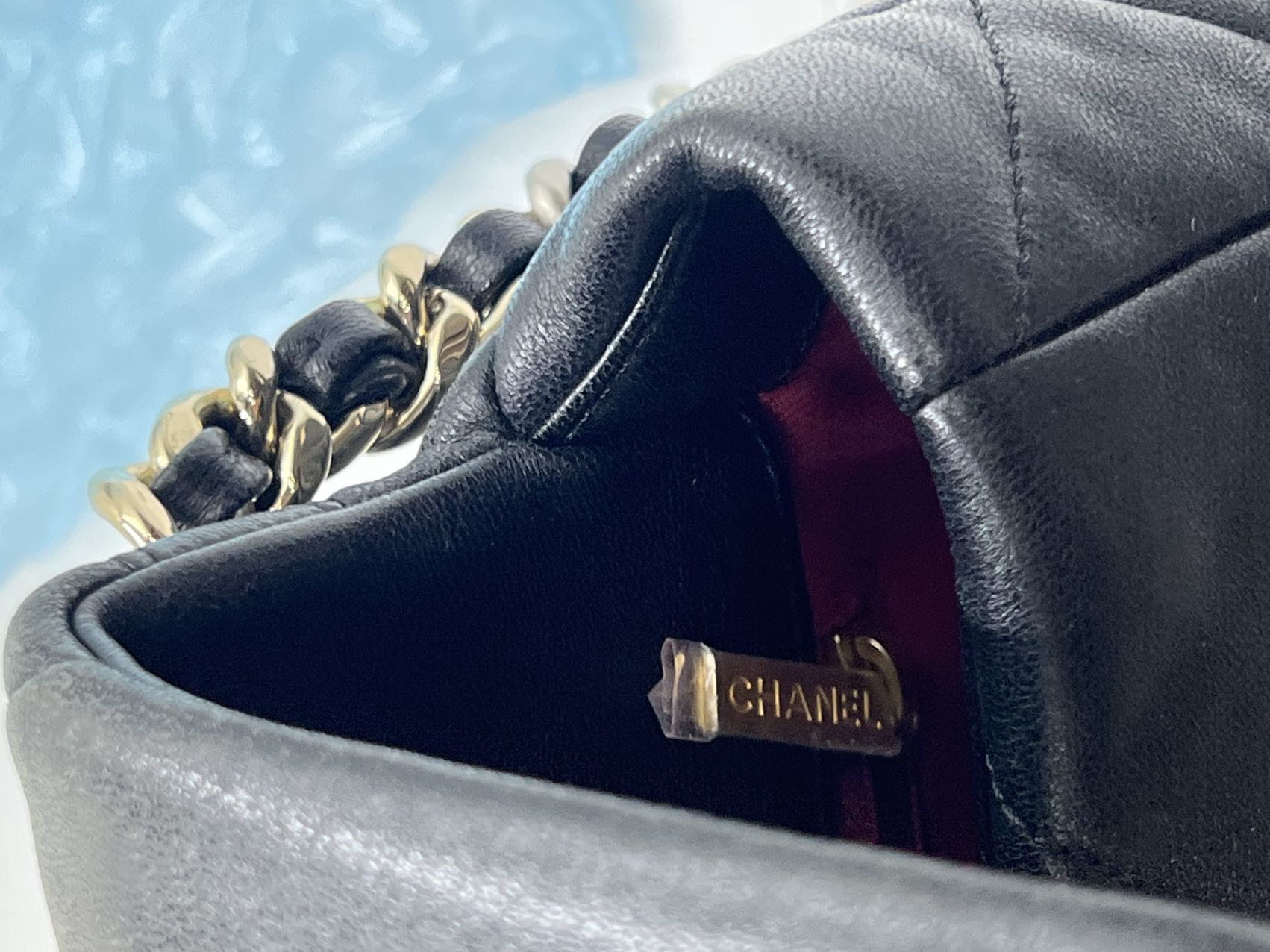 The bag features signature mixed metal hardware, including an aged silver-tone chain-intertwined CC turn-lock closure on the front flap, which operates smoothly. The shoulder strap is a combination of aged silver-tone and gold-tone chain, intertwined with black leather, showcasing the unique design of the 19 Bag.