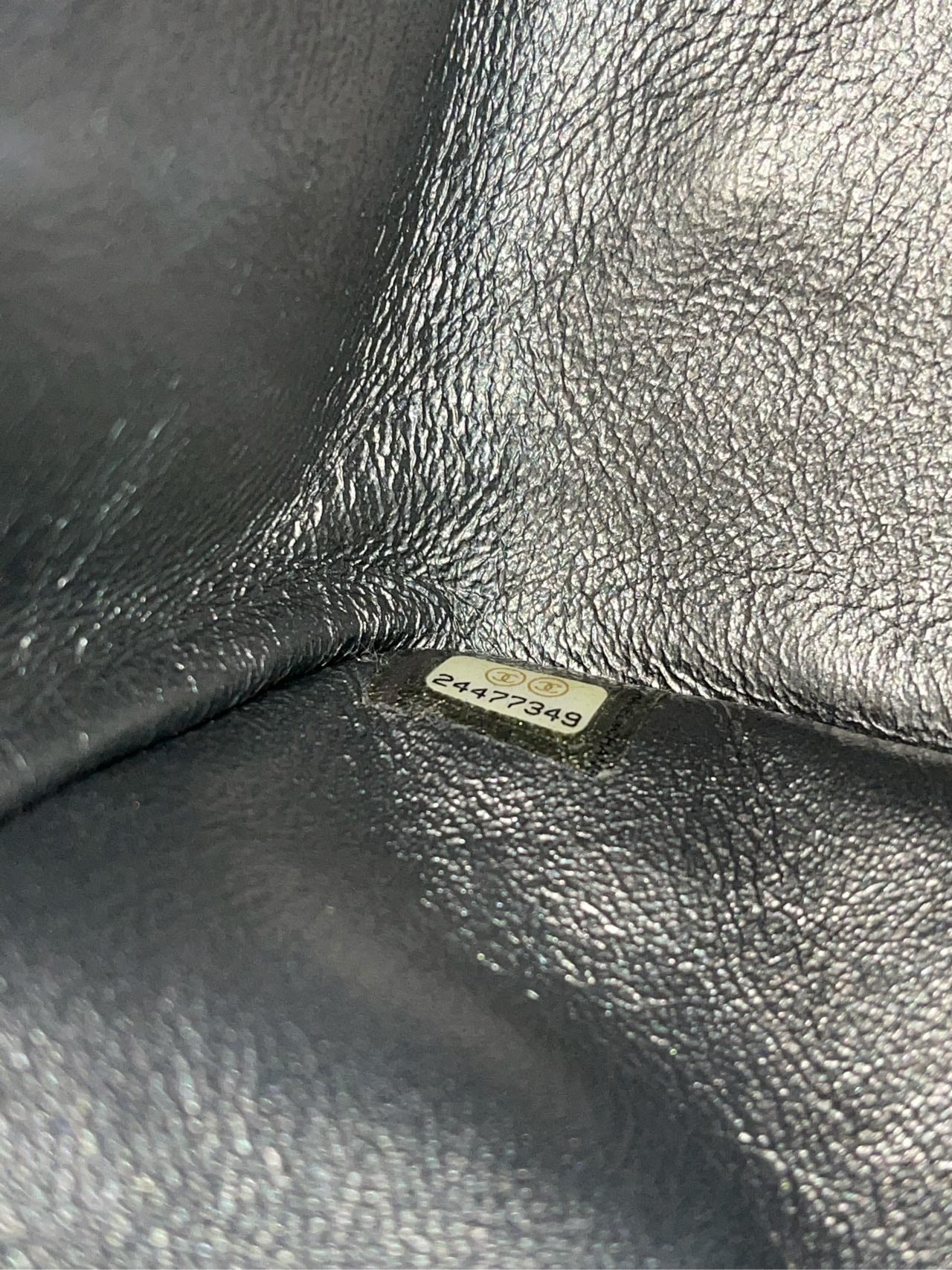 Crafted from a striking iridescent calfskin leather in a charcoal grey hue, this 2.55 features Chanel's signature diamond quilting throughout its body and flap. A classic half-moon slip pocket is located on the back, offering convenient storage. The unique iridescent finish gives the leather a subtle, shifting sheen under different lighting conditions.