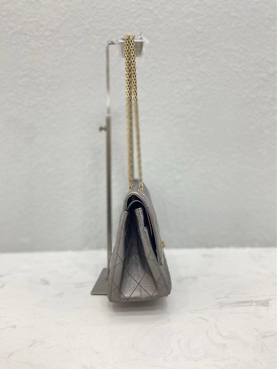This Chanel 2.55 Medium Flap Bag in iridescent charcoal grey calfskin is in very good pre-owned condition, reflecting a '95% new' assessment. The metallic finish of the calfskin retains much of its original luster, showcasing the unique '炫彩' (iridescent) quality. Minimal signs of wear are visible on the exterior, with the diamond quilting remaining plump and well-defined. The gold-tone hardware, including the iconic Mademoiselle lock and all-chain strap, is bright with only minor hairline scratches consistent with gentle use. The interior shows light creasing and faint marks on the leather lining, particularly on the inner flap, which is typical for a bag of this age and usage.