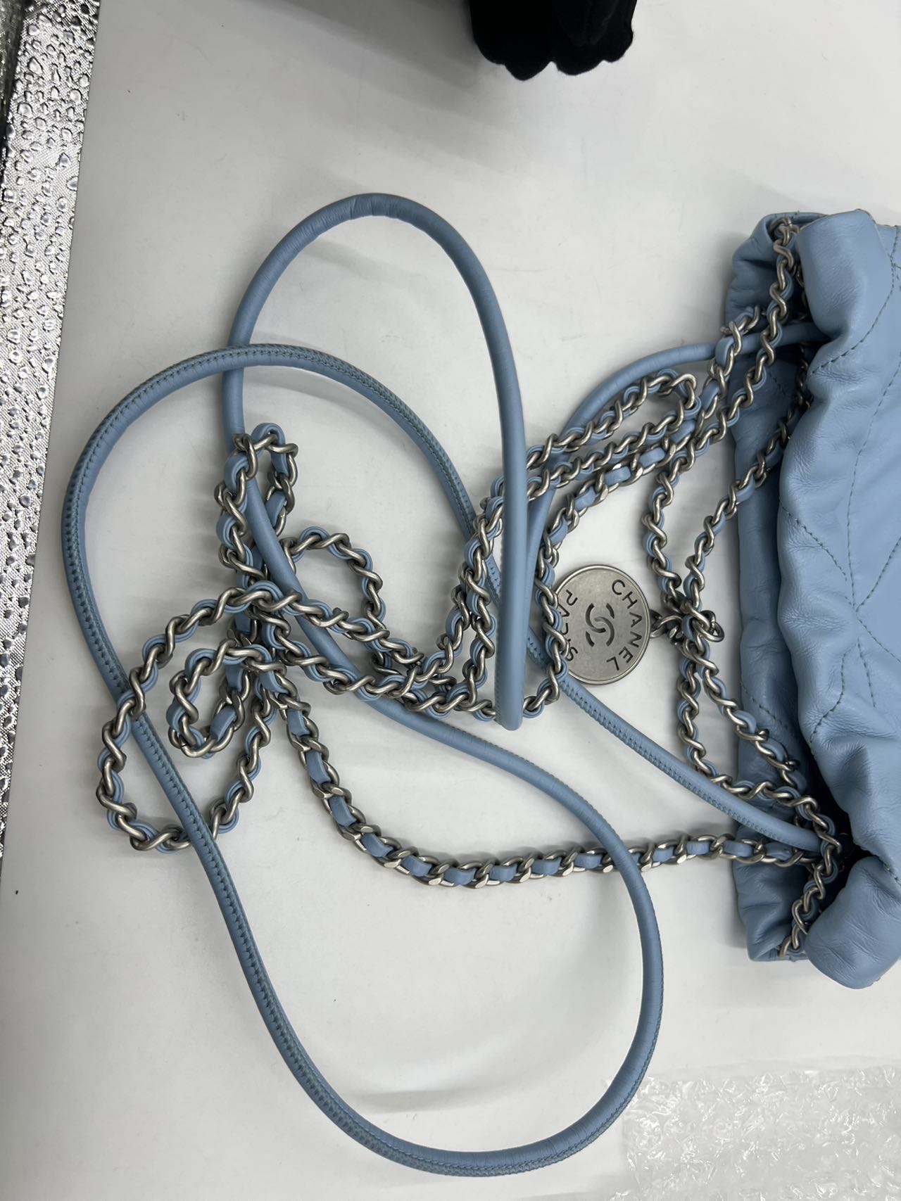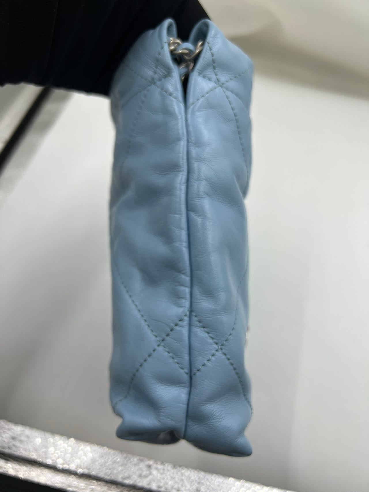 This Chanel 22 Bag Mini is presented in very good pre-owned condition. The supple shiny calfskin exterior maintains its vibrant blue hue with minor signs of gentle use. The characteristic soft, slouchy structure is well-preserved. There are faint superficial creasing and minor indentations consistent with the material and normal wear, particularly noticeable around the corners and base. The silver-tone hardware is bright and shiny, showing only minimal hairline scratches. The interior is clean and free from significant marks.