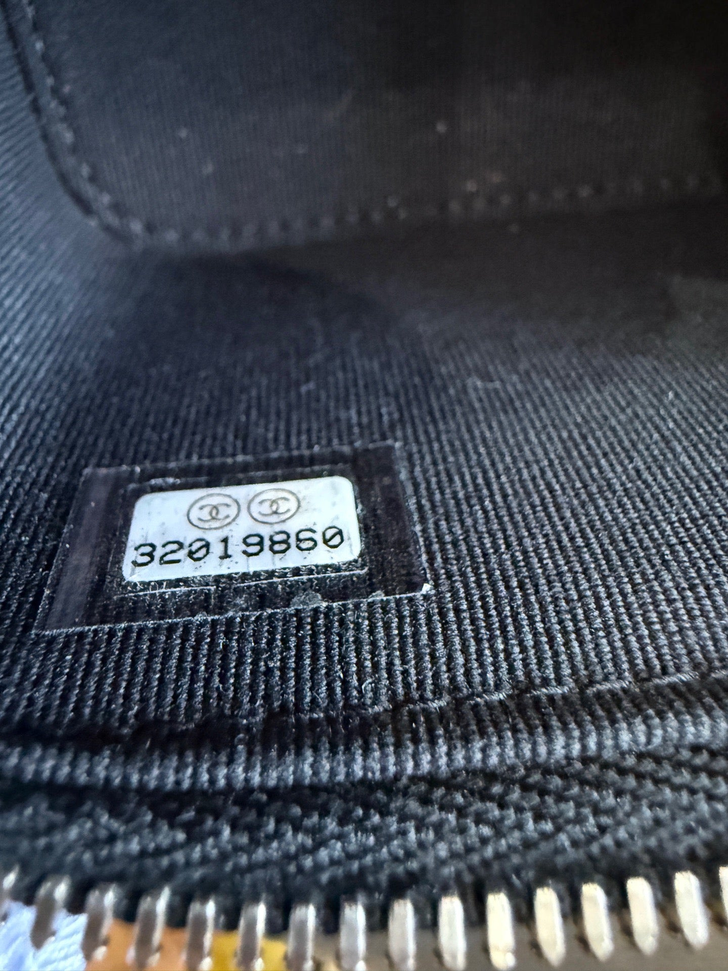 Shiny silver-tone hardware, including the robust top zipper, the elegant chain strap, and the iconic front CC logo. The chain strap is uniquely adorned with delicate black enamel links, adding a distinctive design element. The 'CHANEL' engraved zipper pull operates smoothly and securely.