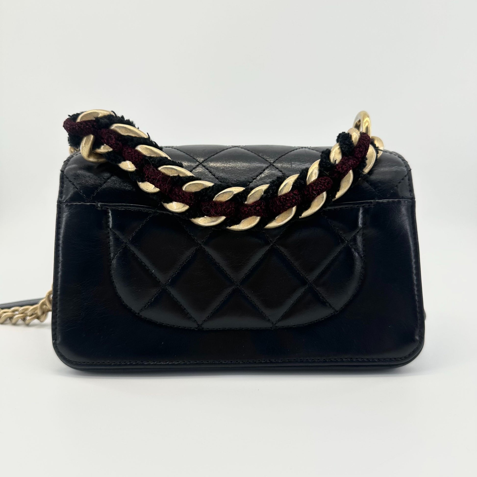 Features polished gold-tone hardware, including the iconic CC turn-lock closure on the front, which functions smoothly. The top handle chain strap is intricately interwoven with both gold-tone metal links and a distinctive black and burgundy/dark red woven fabric, providing a unique textural contrast. The larger rings connecting the strap are also gold-tone.