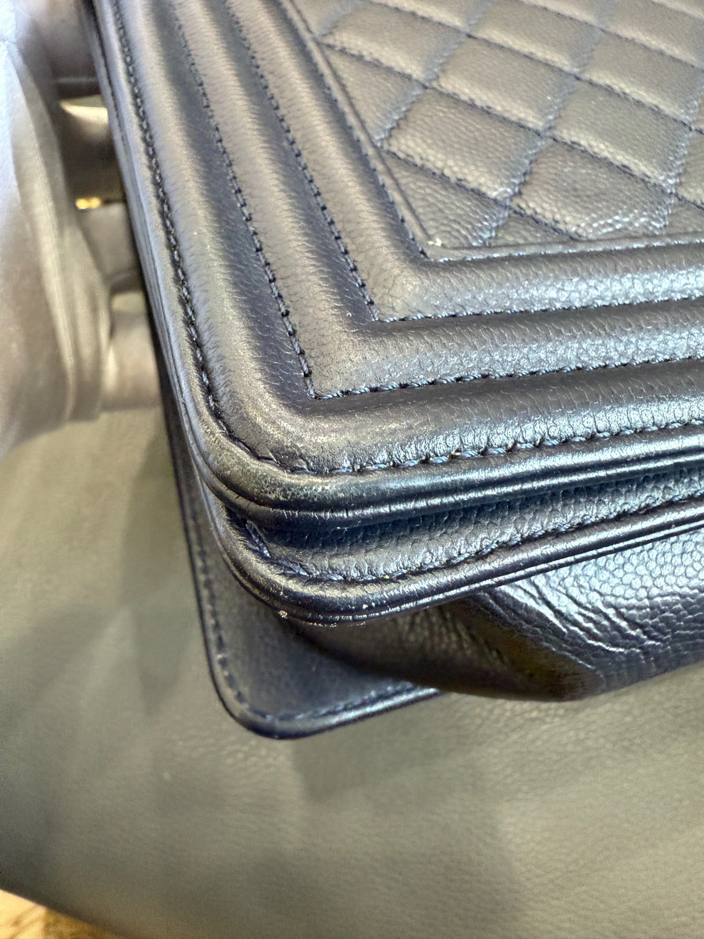 This Chanel Boy Bag in navy blue caviar leather and gold-tone hardware is in good pre-owned condition. The exterior leather maintains its structured shape and iconic diamond quilting with minimal signs of wear. There is some slight rubbing visible on the bottom corners and the edges of the flap. The gold-tone hardware, including the signature Boy CC push-lock closure and the chain strap, shows visible surface scratches, some dulling, and minor plating loss consistent with regular use. The interior is clean with no significant stains or damage. The strap leather shows slight creasing.
