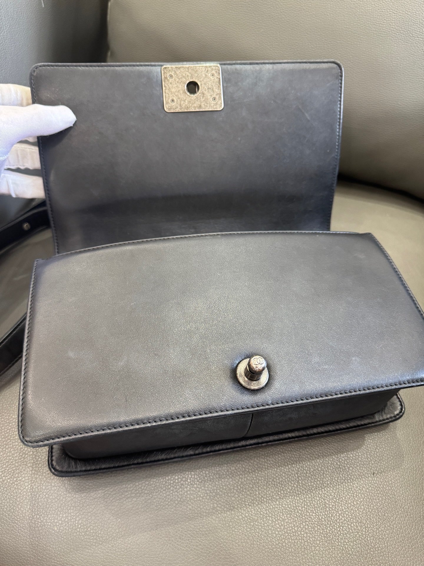 This Chanel Boy Bag in medium size is in very good pre-owned condition. The exterior lambskin leather maintains its rich black color and signature diamond quilting, showing minimal signs of wear such as light creasing consistent with gentle use. The structured shape of the bag is well-preserved. The distressed silver-tone hardware, including the iconic Boy lock and chain strap, remains functional and visually appealing with no significant tarnishing or damage. The interior is clean with some light superficial marks and creasing on the leather flap, but no major stains or odors.