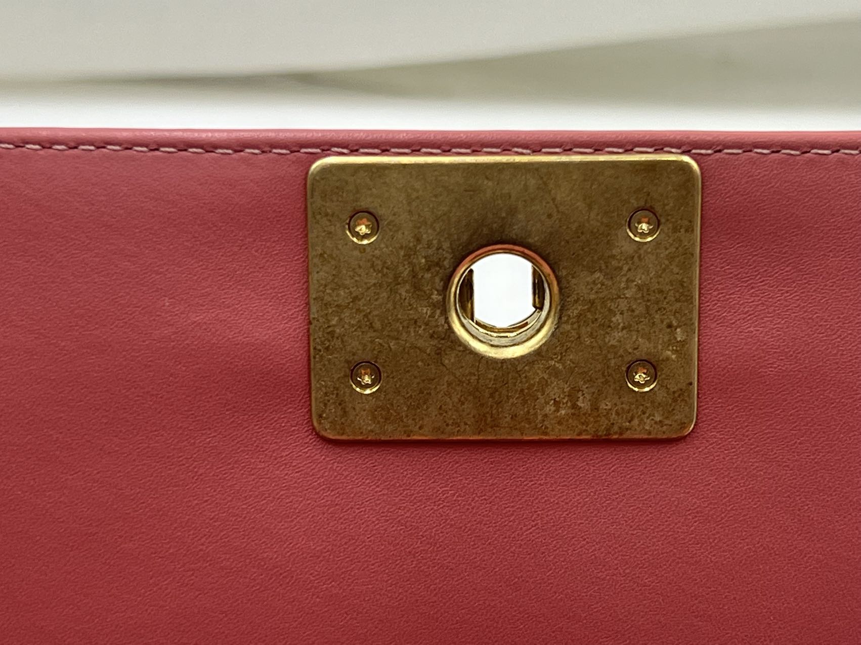 This Chanel Boy Small bag is presented in very good pre-owned condition. The pink calfskin exterior maintains its structured shape and vibrant color, with the diamond quilting remaining largely puffy and well-defined. There is minor rubbing visible on one corner of the flap, consistent with gentle use. The aged gold-tone hardware shows light surface wear and a characteristic patina, but remains fully functional and visually appealing. The interior is clean with minimal signs of use.
