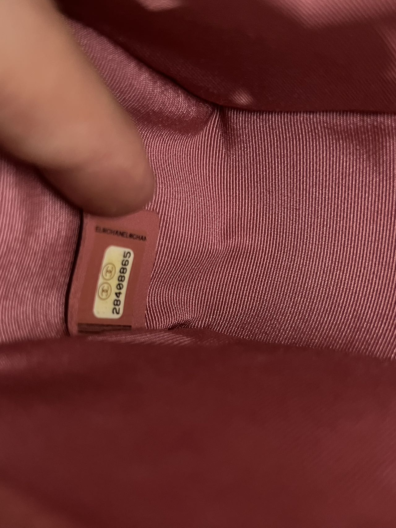 The interior is lined with a coordinating pink textile, likely grosgrain fabric, providing a clean and organized space. It features a main compartment with a slip pocket, bearing the 'CHANEL MADE IN ITALY' stamp and the authenticity sticker with the serial number.