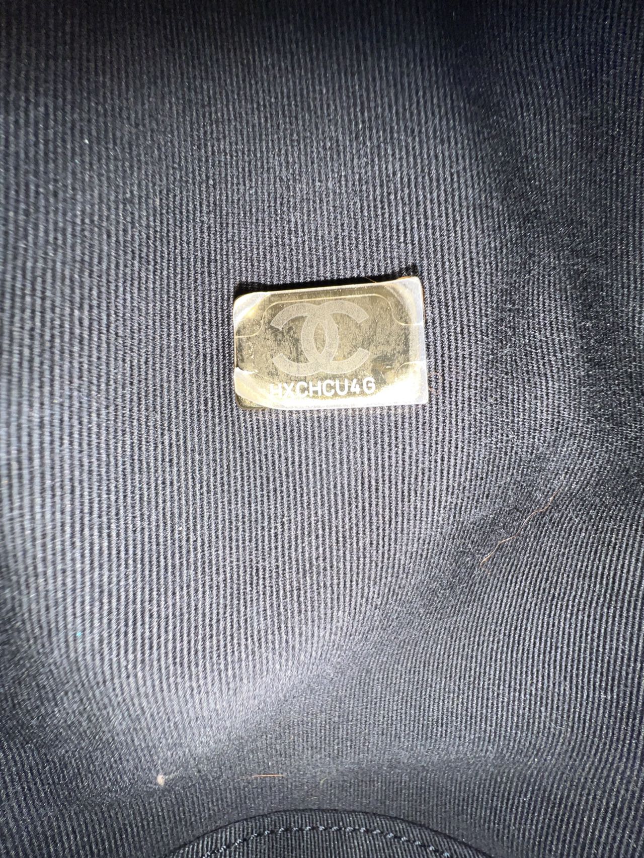 The interior is lined with a durable black fabric, showing a clean and well-kept condition. A leather 'CHANEL' logo tag is present, along with the modern 21-series authenticity chip.