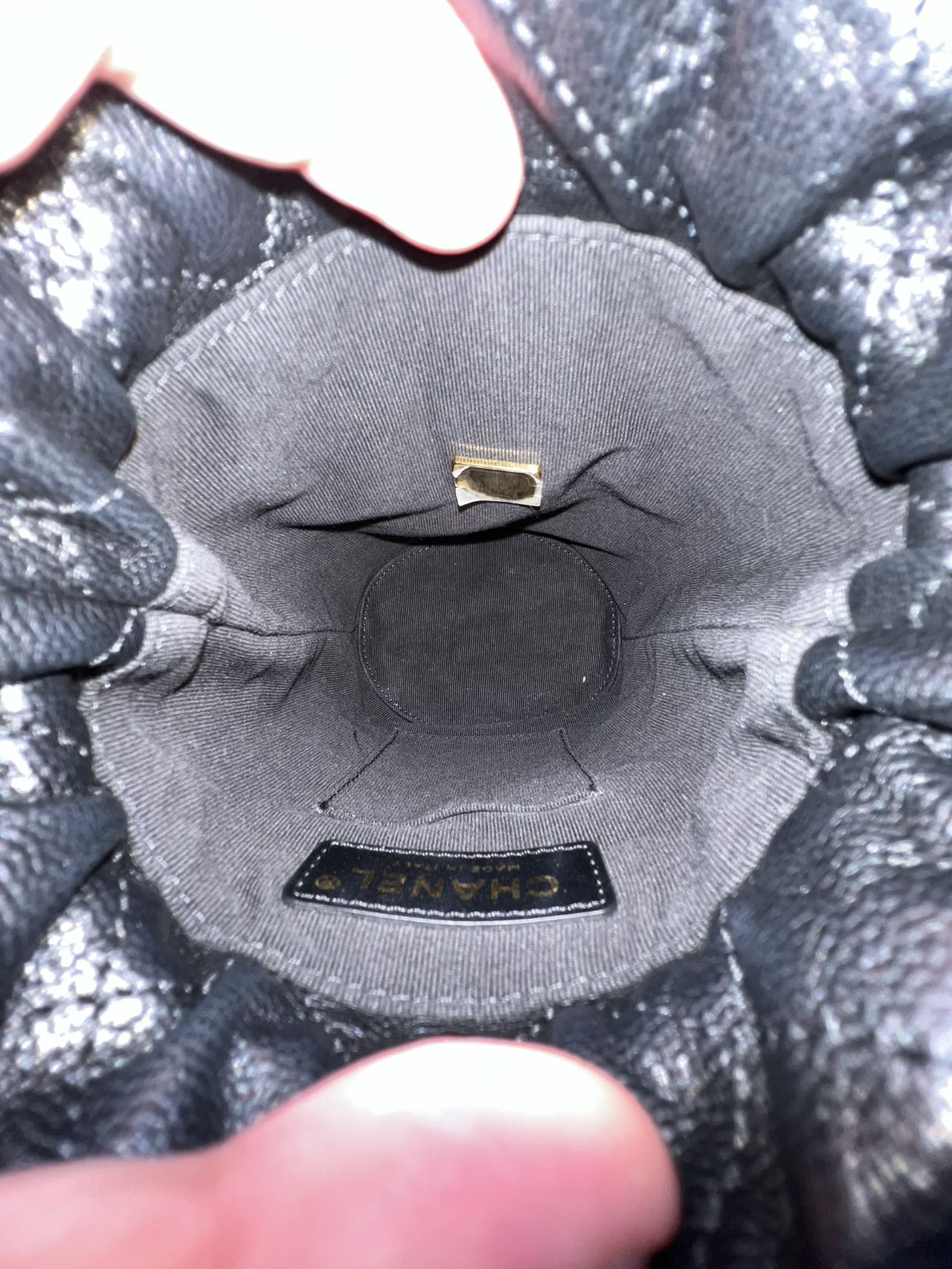This Chanel Black Velvet Mesh Bucket Bag with a 21-series authenticity chip is in very good pre-owned condition. The quilted lambskin leather on the upper portion remains supple with excellent structure. The distinctive black velvet mesh overlay is intact with no visible pulls or significant wear. The gold-tone hardware, including the iconic CC logo and chain strap, is bright and shiny with only minor hairline scratches consistent with gentle use. The interior is clean and well-maintained.