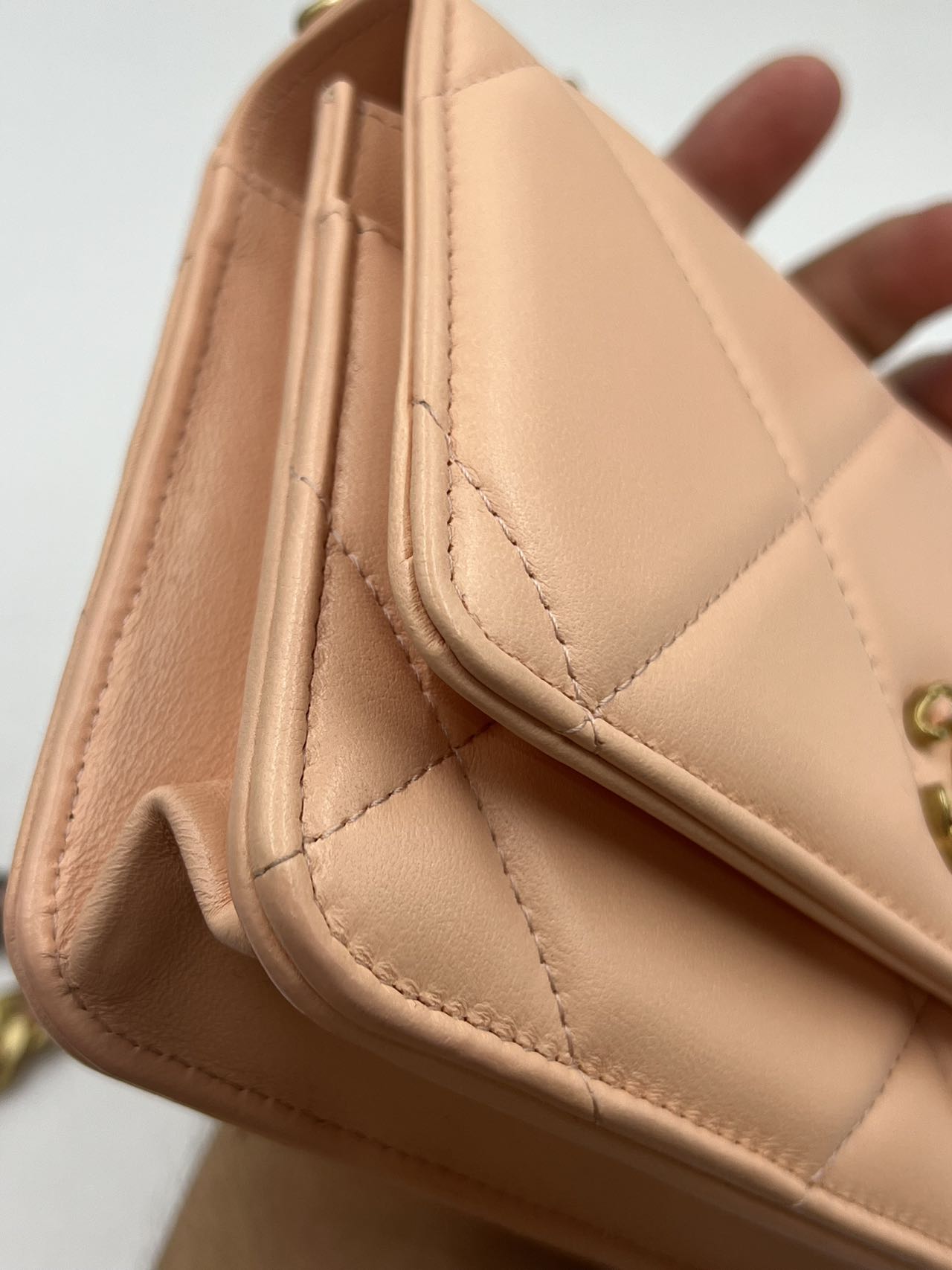 This Chanel 19 Wallet On Chain (WOC) is in very good pre-owned condition, showing minimal signs of wear. The lambskin exterior retains its supple texture and plump diamond quilting, with no significant scuffs or marks visible. The mixed-tone hardware is bright and intact, with only minor hairline scratches consistent with gentle use. The interior is clean with no noticeable stains or damage, and the overall structure of the bag is well-maintained.