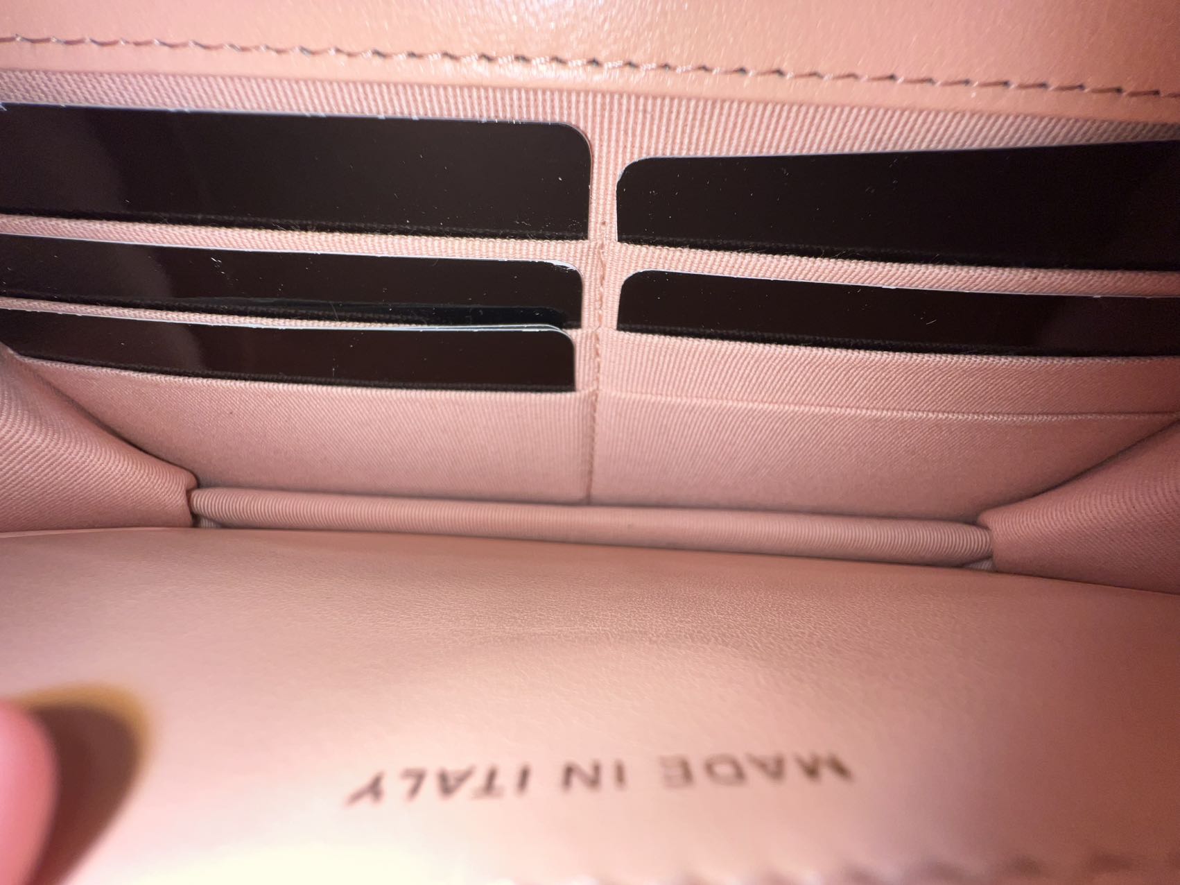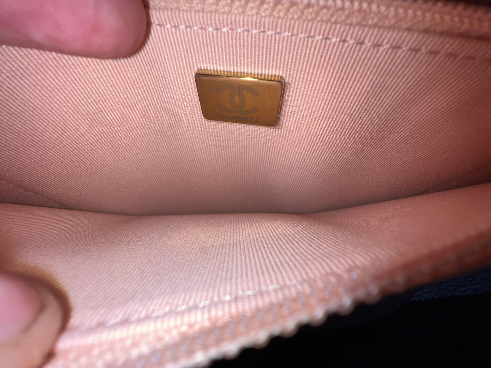The interior is lined with matching pink leather and textile, offering practical organization typical of a WOC. It includes multiple card slots, a main compartment, a slip pocket, and a zippered pocket conveniently located on the interior of the flap. The 'MADE IN ITALY' stamp is clearly visible, along with the contemporary Chanel microchip for authenticity.