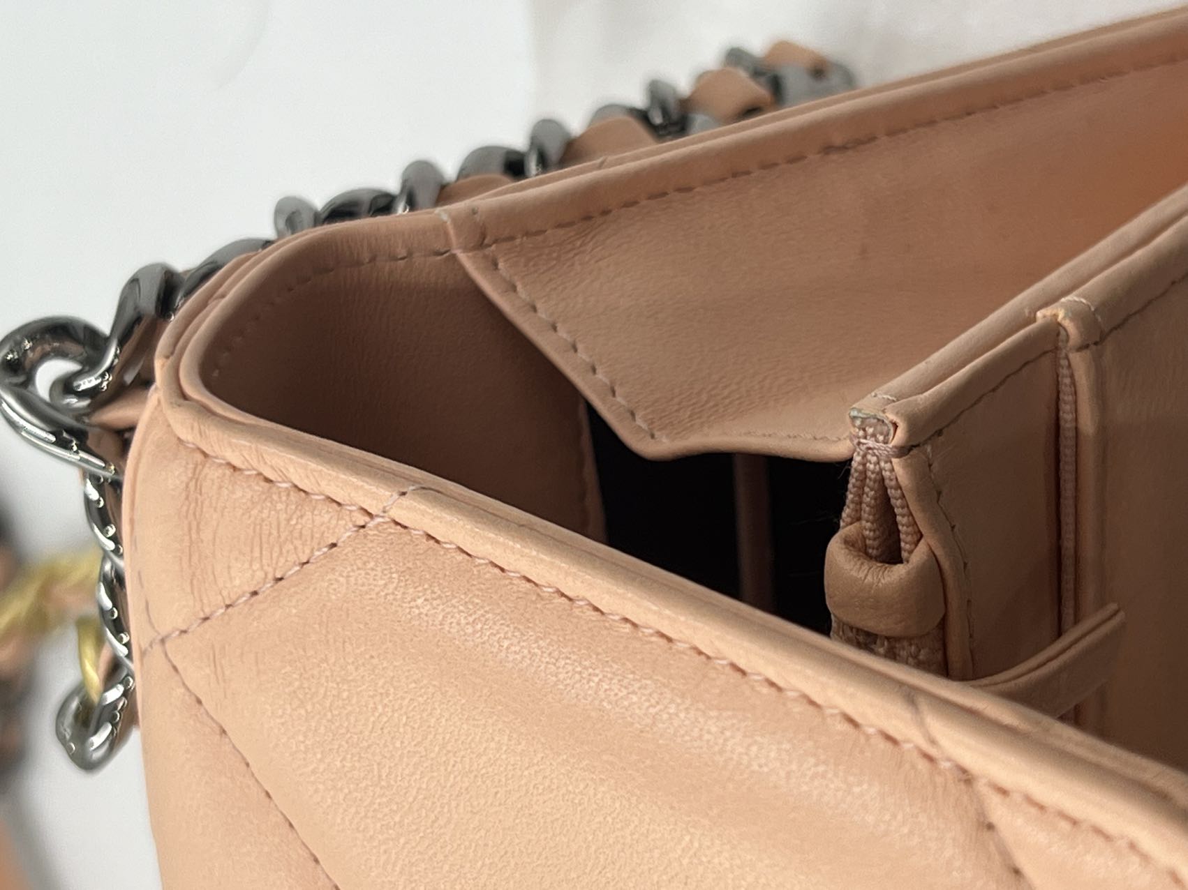 The bag features distinctive mixed-tone hardware, combining antique gold-tone and ruthenium-finish chains for a modern aesthetic. The CC logo on the front is crafted from antique gold-tone chain interwoven with pink leather. The internal magnetic snap closure is also gold-tone, functioning smoothly.