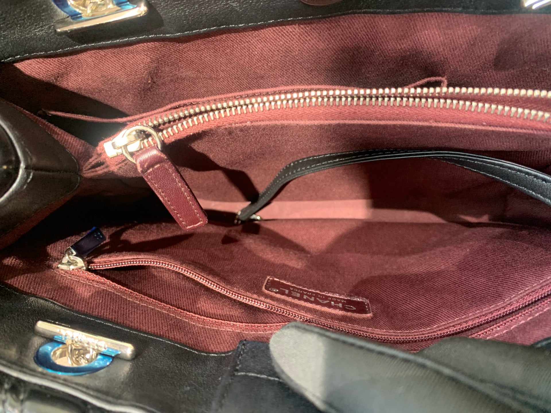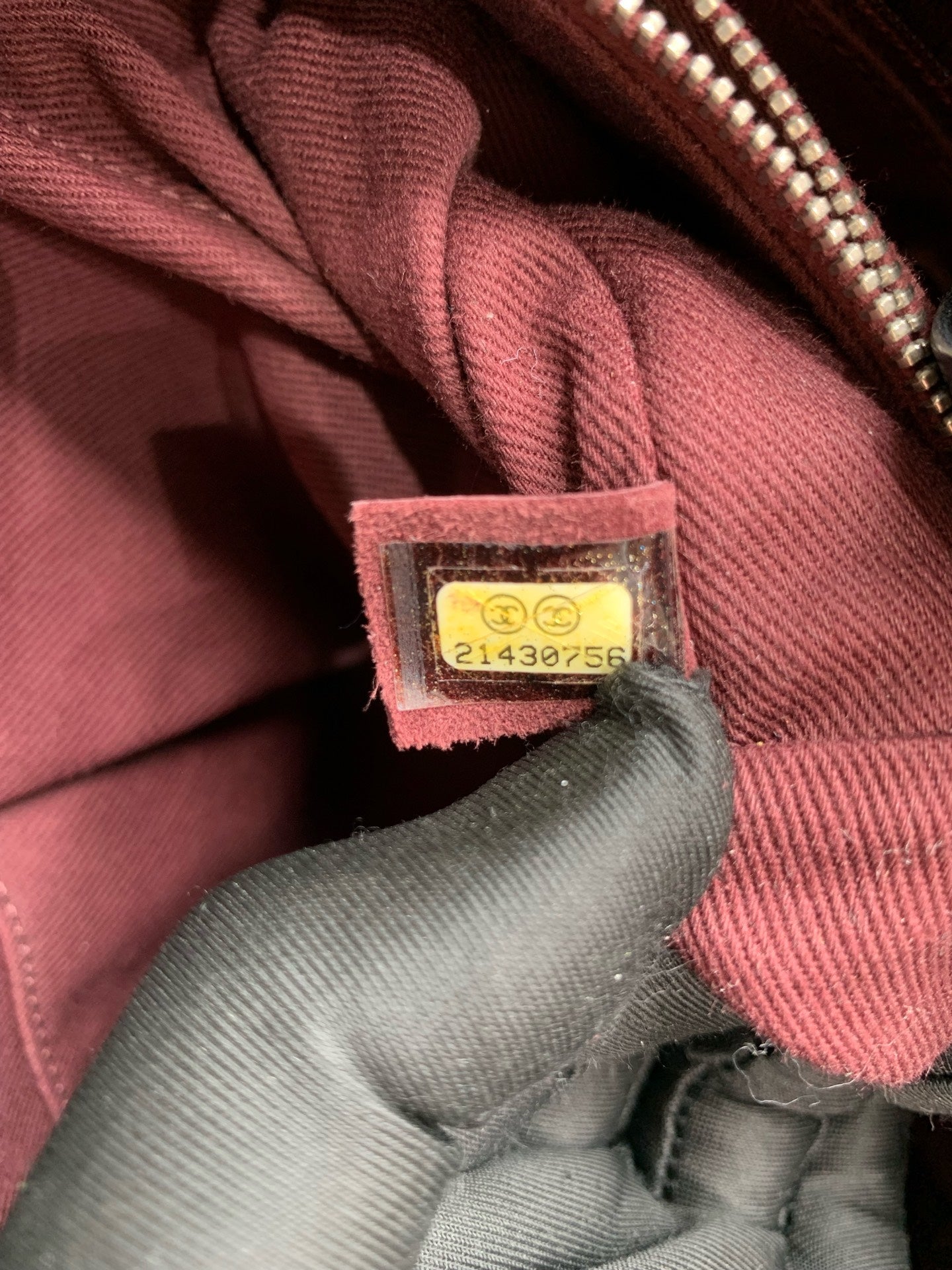 The interior is lined with a clean, dark red (burgundy) textile fabric, free from significant stains or debris. It features multiple compartments and zippered pockets, providing ample organization space. A Chanel serial sticker is present.