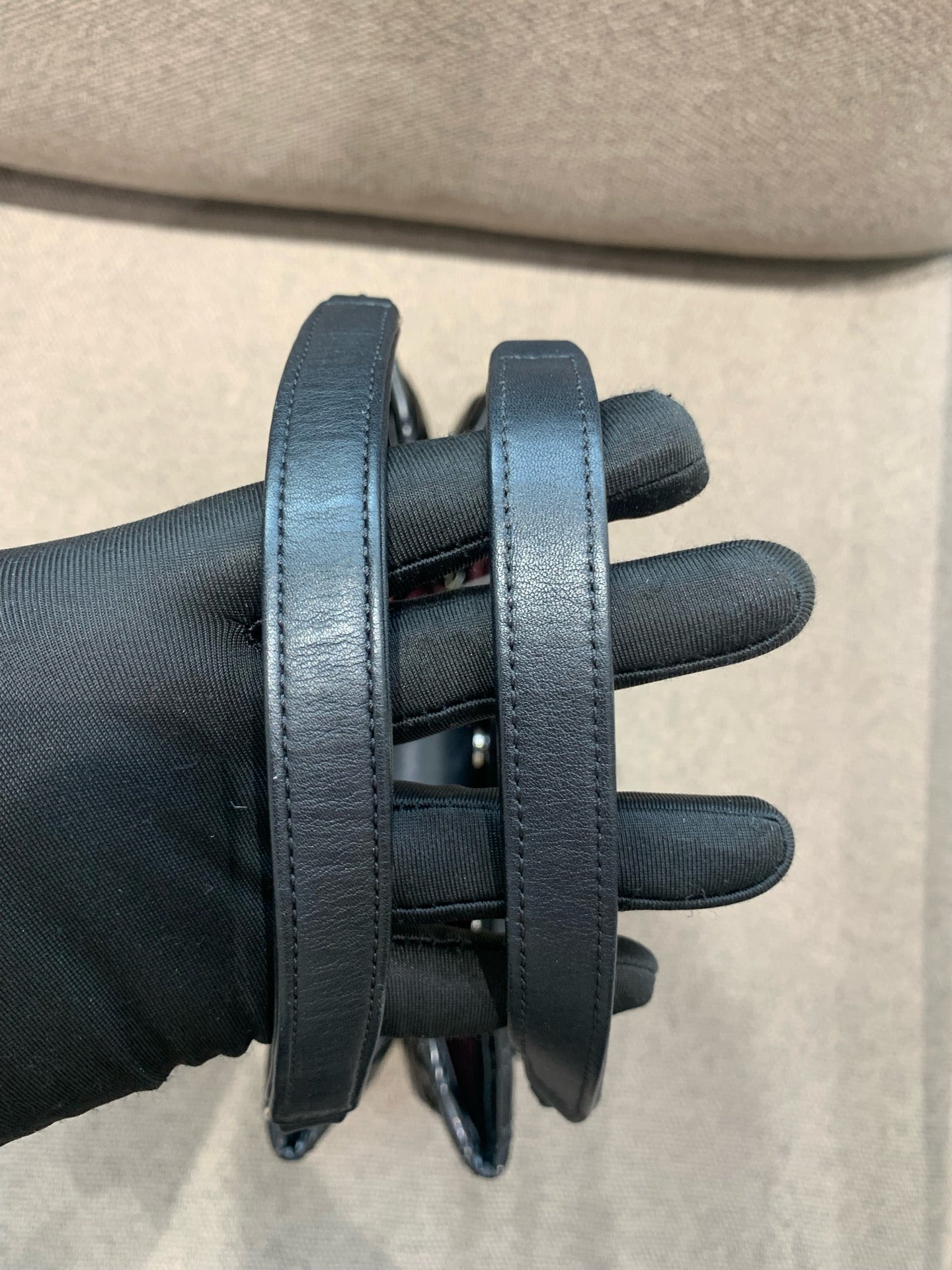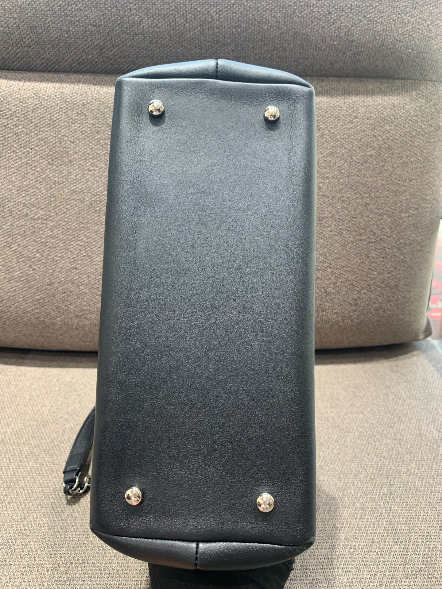 Adorned with polished silver-tone hardware, including chain-link shoulder straps interwoven with black leather, a decorative CC logo charm, and protective feet at the base. The hardware displays minor signs of wear such as faint scratches, but remains functional and shiny.