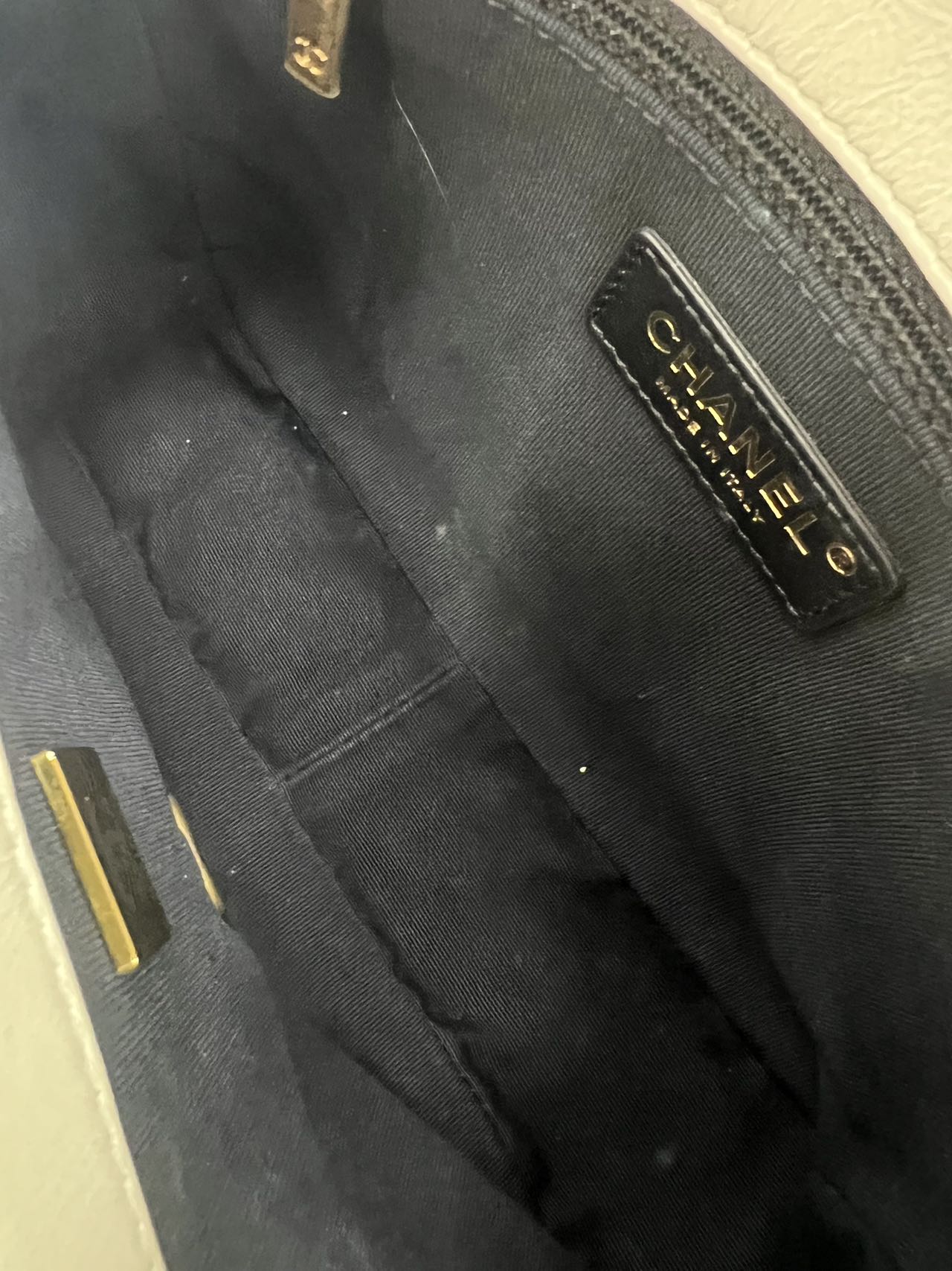 The interior is lined with a contrasting black fabric, providing a clean and organized space. It features a main compartment with a leather 'CHANEL MADE IN ITALY' tag and an internal authenticity chip, visible within. The interior appears clean with no significant signs of wear or stains.