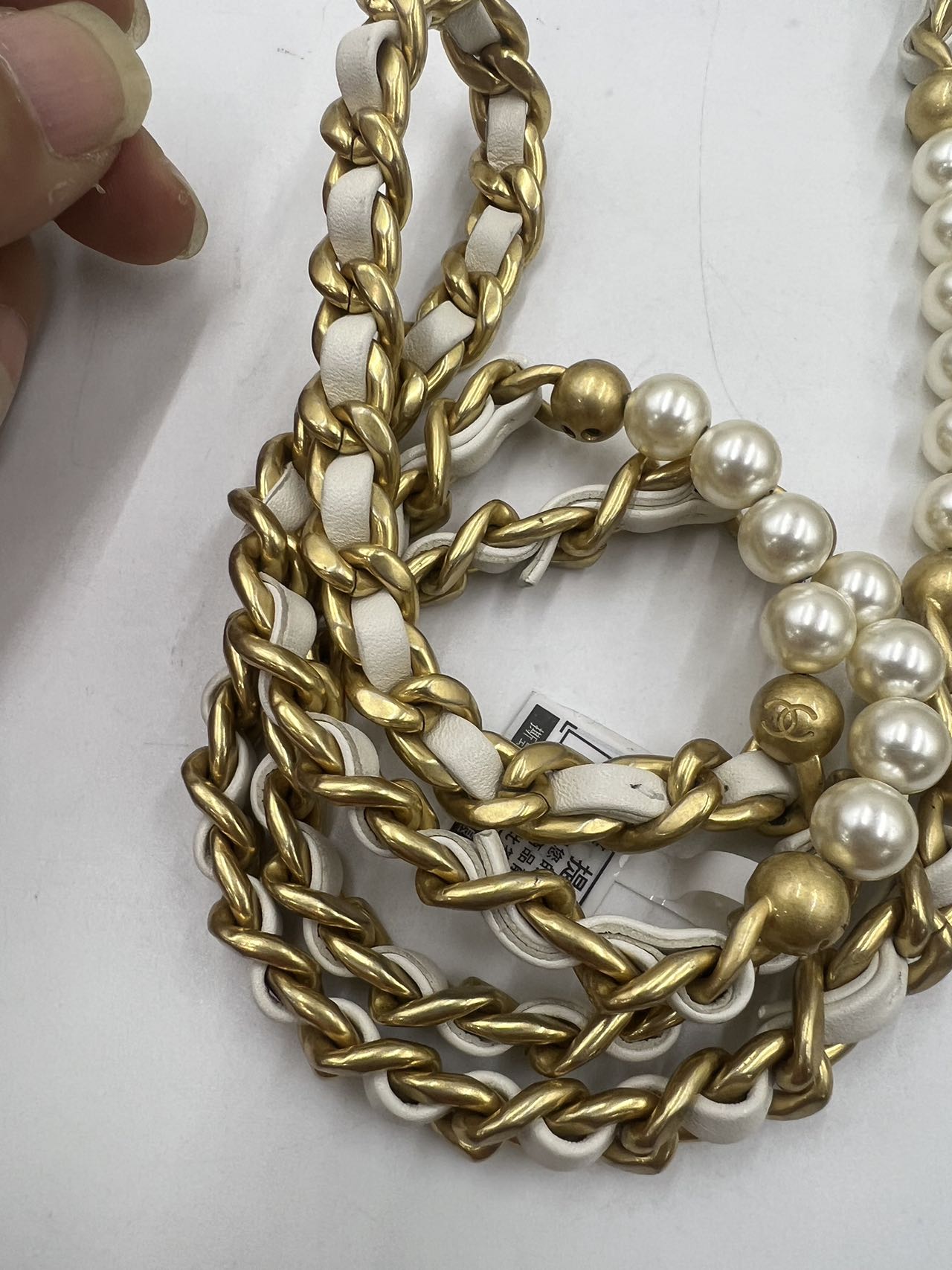 Adorned with radiant gold-tone hardware, prominently featuring a CC turn-lock closure exquisitely embellished with two lustrous pearls. The chain strap is a luxurious combination of gold-tone metal, interwoven white leather, and elegant pearl accents, allowing for versatile shoulder wear.