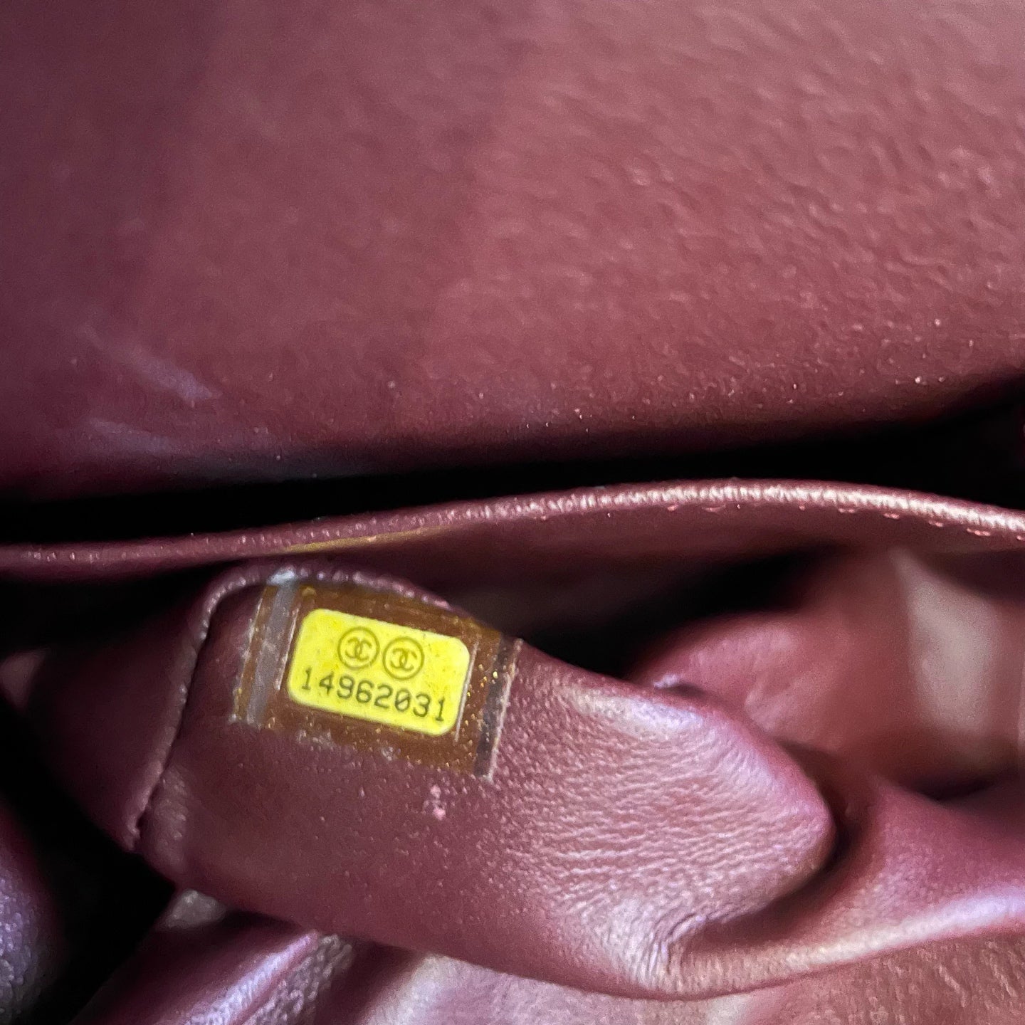 The interior is lined with a rich burgundy leather, featuring the 'CHANEL® MADE IN FRANCE' gold stamp under the first flap. It is organized with multiple compartments, including a main open section, a flat slip pocket, and a zippered pocket under the main flap, all in clean condition.