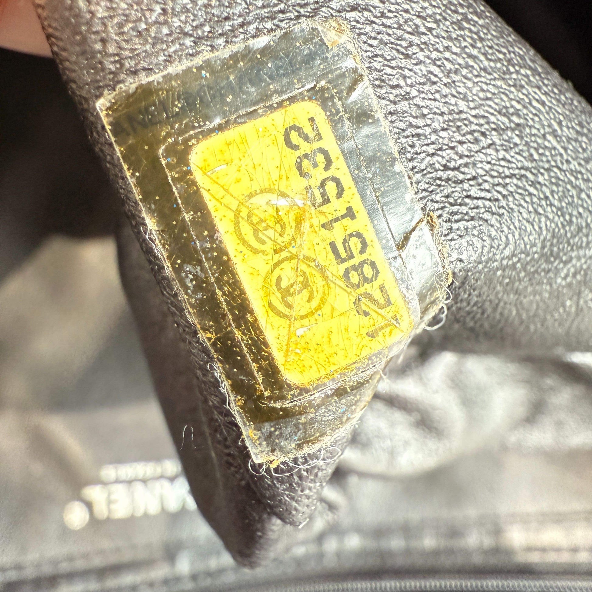 This Chanel Classic Flap Jumbo bag is in good pre-owned condition, reflecting its vintage nature and prior use. The charcoal grey lambskin exterior shows visible softening, creasing, and some loss of original puffiness in the diamond quilting. There are signs of wear on the edges and corners, consistent with regular handling. The silver-tone hardware exhibits scratches and some dullness, particularly on the CC turn-lock and chain strap. The interior lining shows general signs of use, and the serial sticker is present but significantly worn and peeling. Despite these signs of wear, the bag maintains its iconic silhouette and remains fully functional.