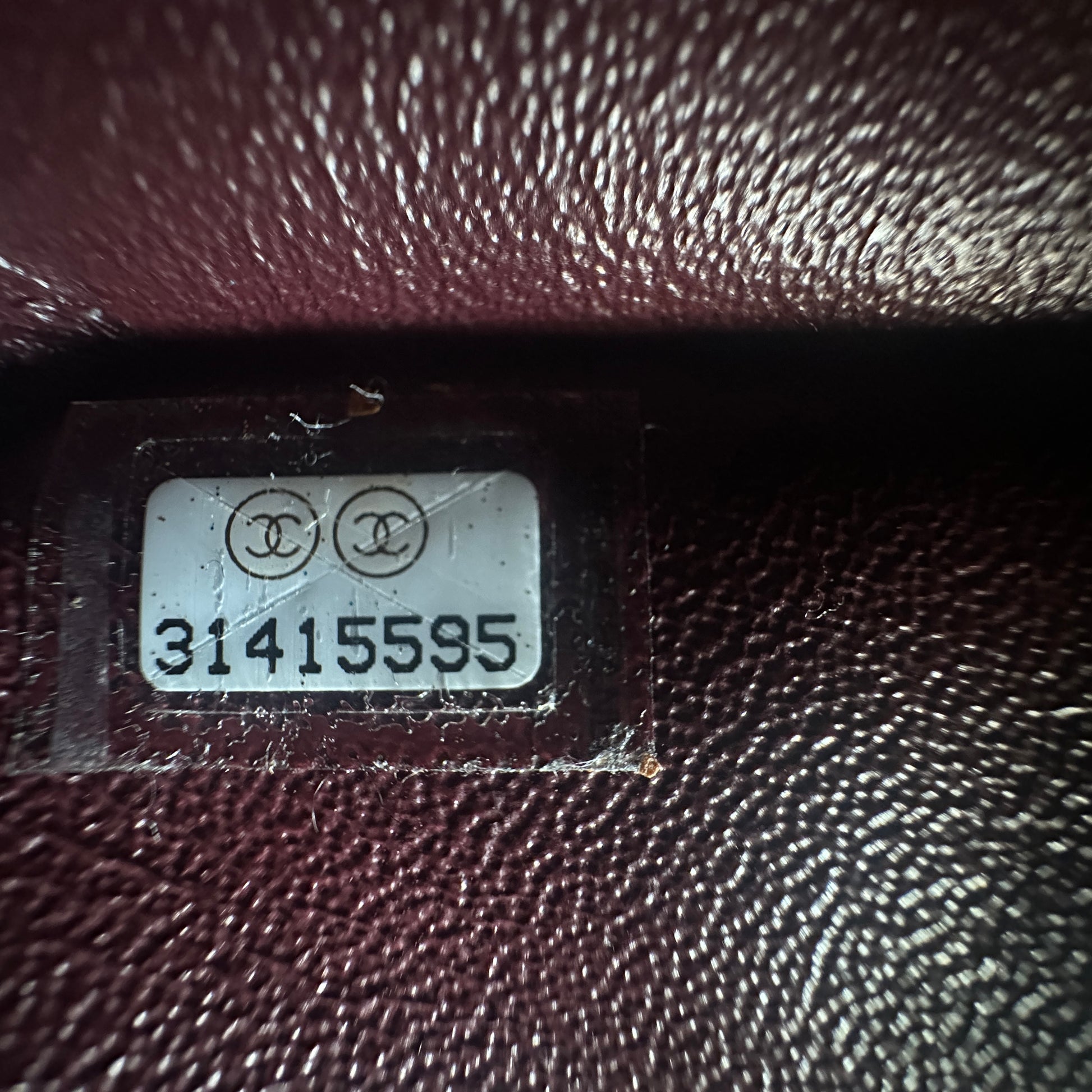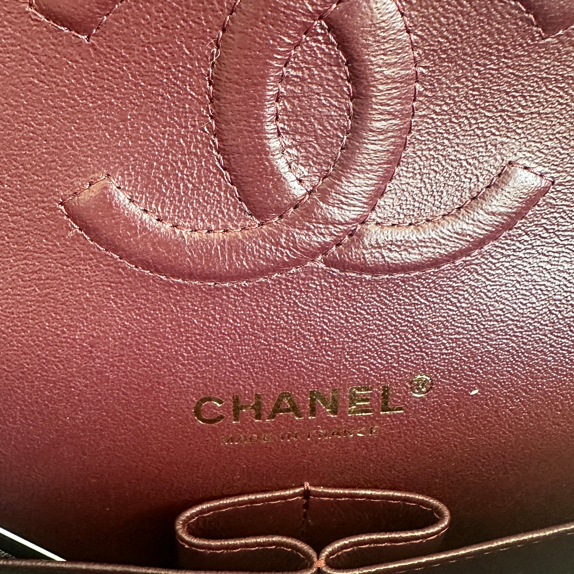 The interior is lined with a rich burgundy leather, a signature detail for the Classic Flap. It features a main compartment, multiple slip pockets, and a discreet zip pocket under the top flap, all areas appearing clean and showing minimal signs of use. The 'CHANEL' logo is embossed in gold on the interior flap, with distinct intertwined CCs stitched above.