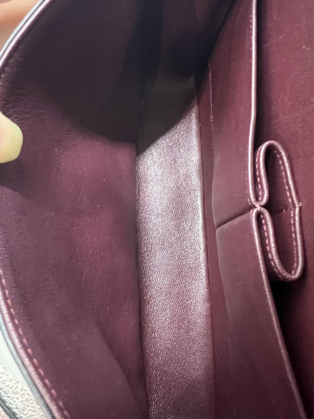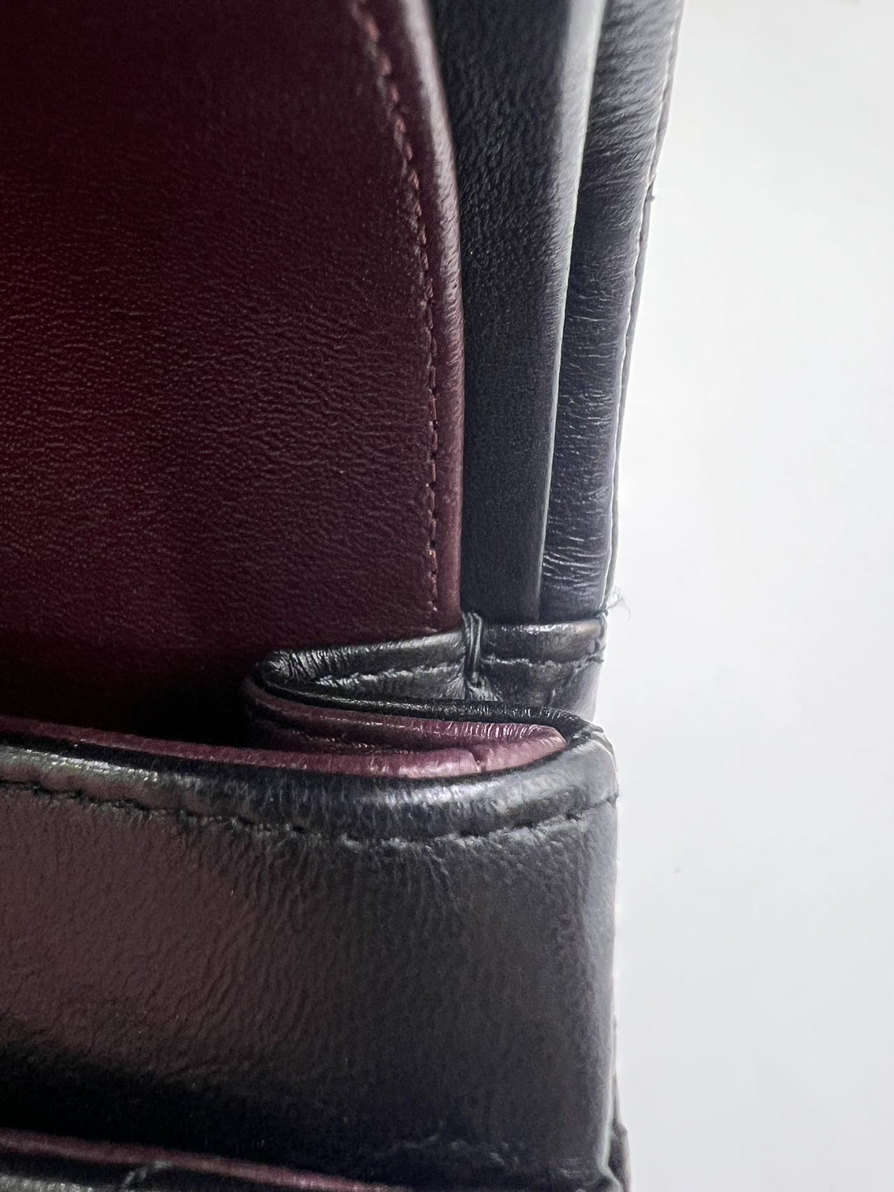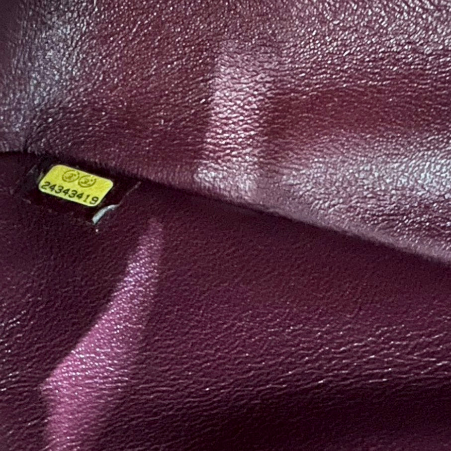 This bag features the classic double flap design, offering multiple compartments for organization. The rich burgundy lining provides a sophisticated contrast to the black exterior. The 24-series serial number indicates its production period.