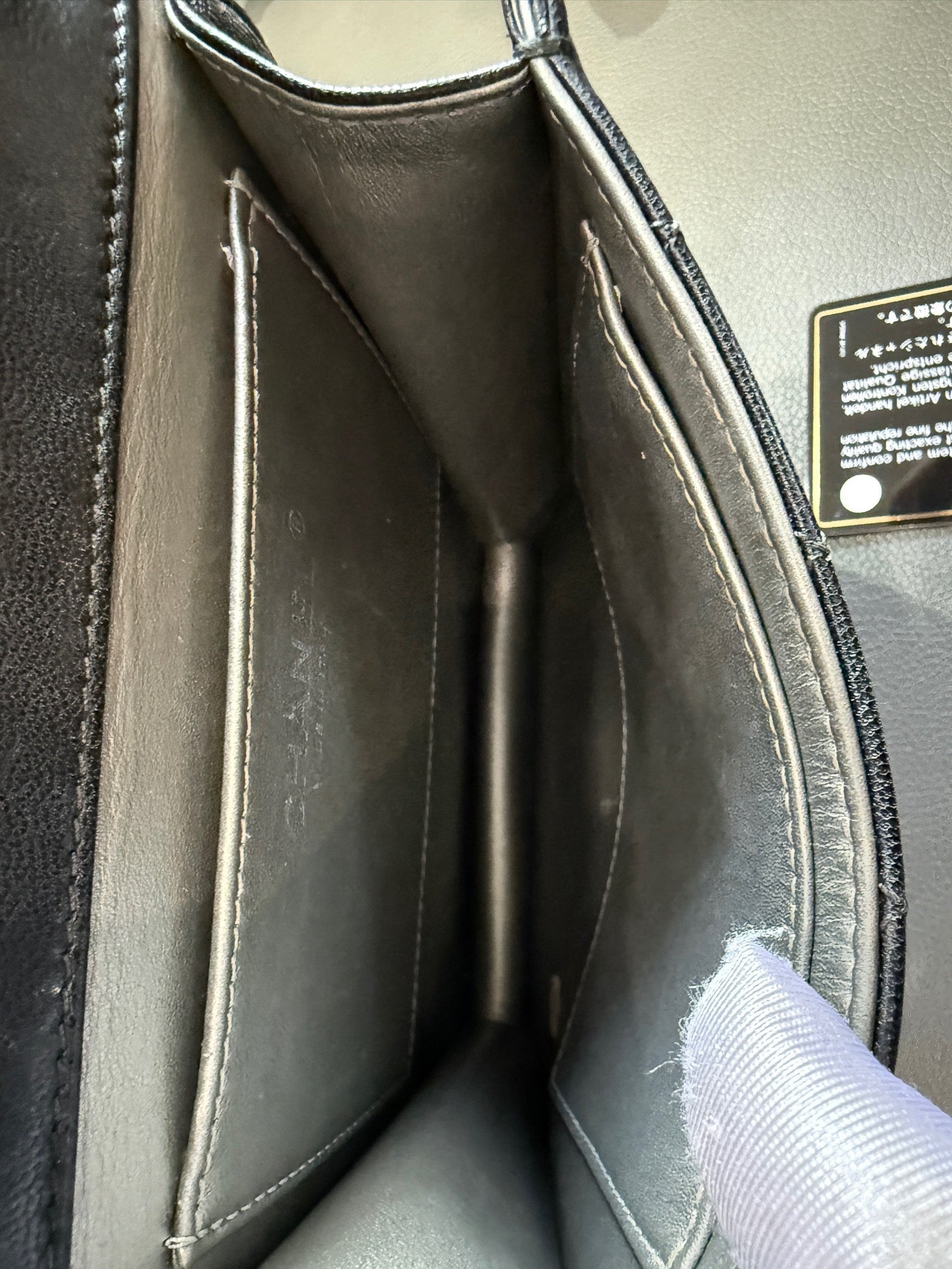 The interior is lined with smooth black leather, offering a compact yet functional space. It includes a main compartment and multiple slip pockets for organization. A 'CHANEL MADE IN ITALY' stamp is present inside, confirming its origin. The interior is generally clean with minor superficial marks consistent with use.