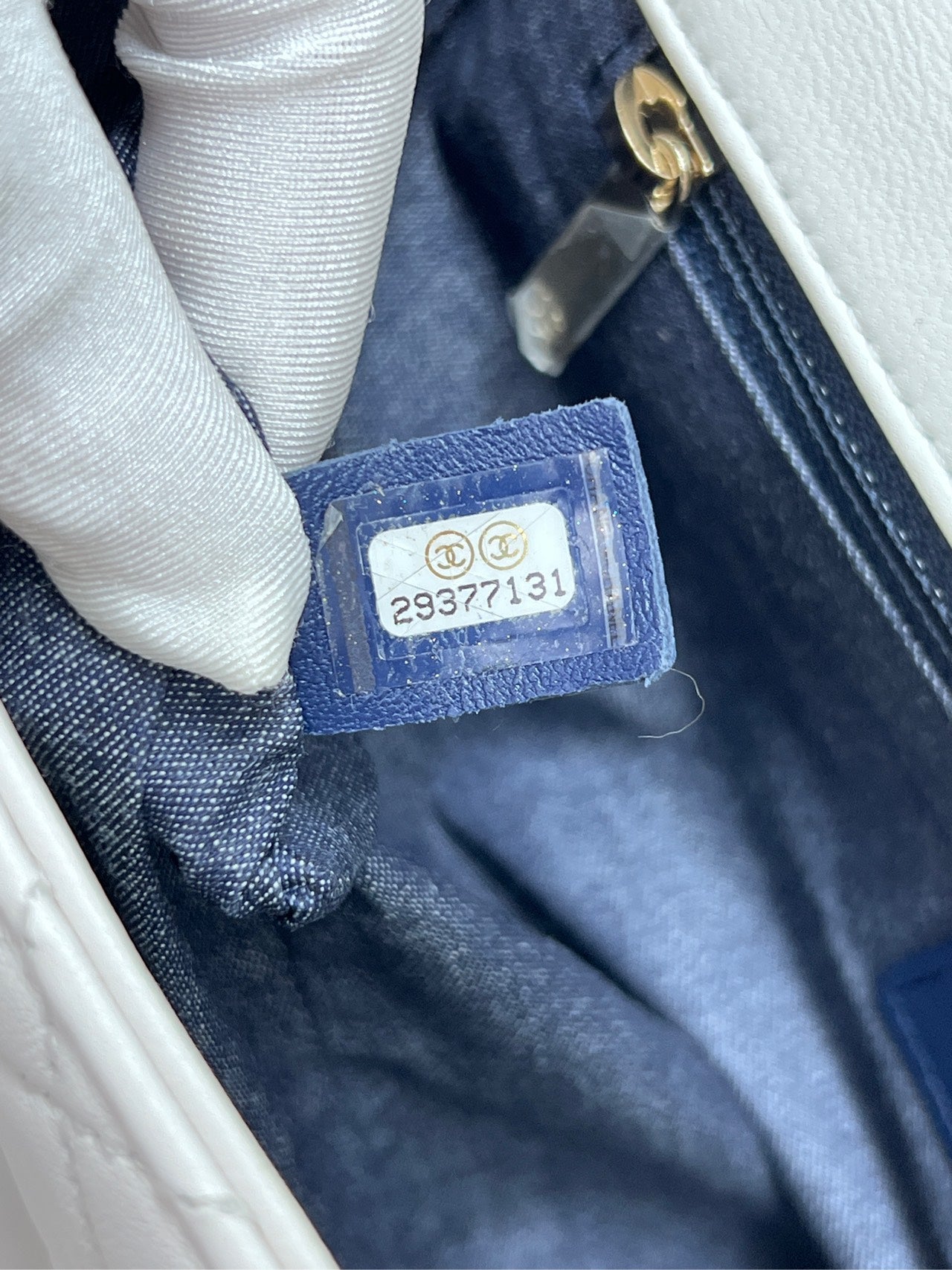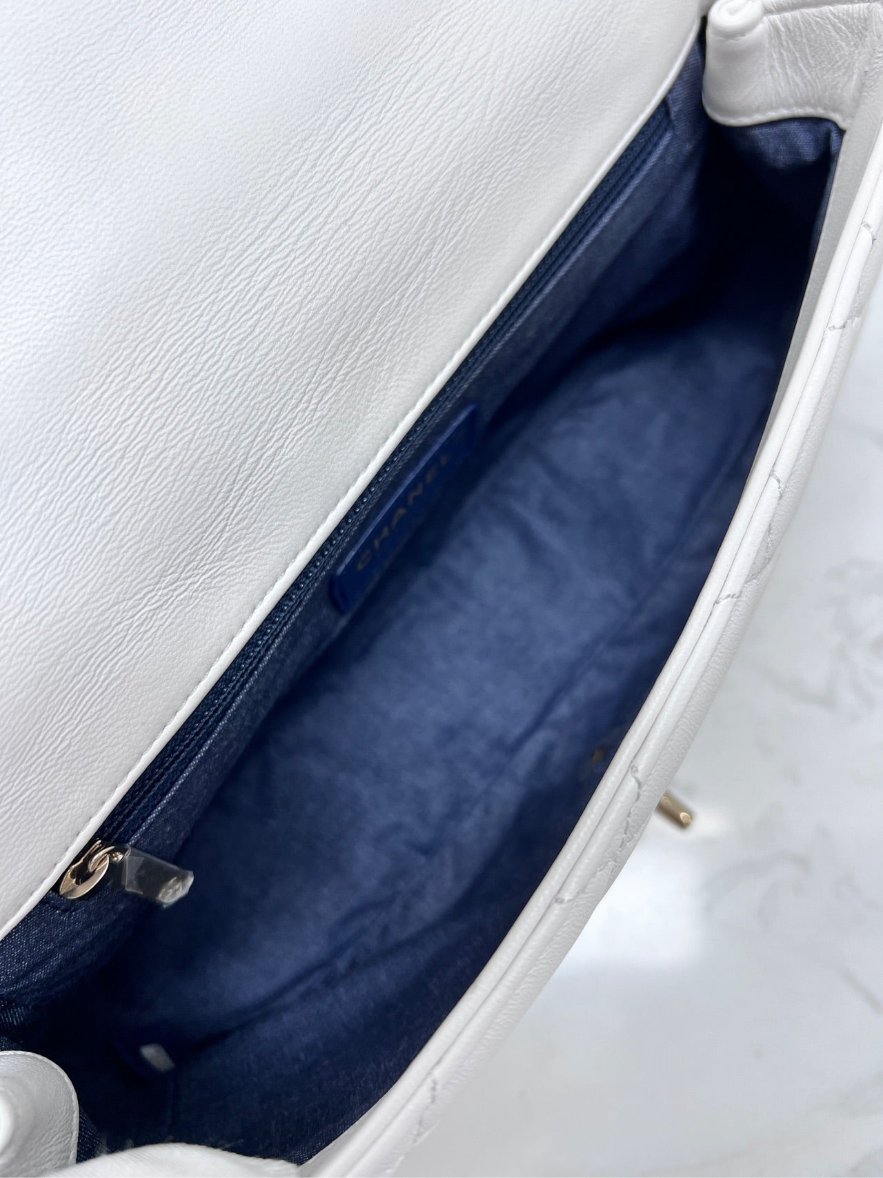 The interior is lined with a durable navy blue textile, reminiscent of denim, providing a striking contrast to the white exterior. It features a main compartment, a flat slip pocket, and a zippered pocket, offering practical organization for essentials. The interior is clean with no discernible stains or odors.