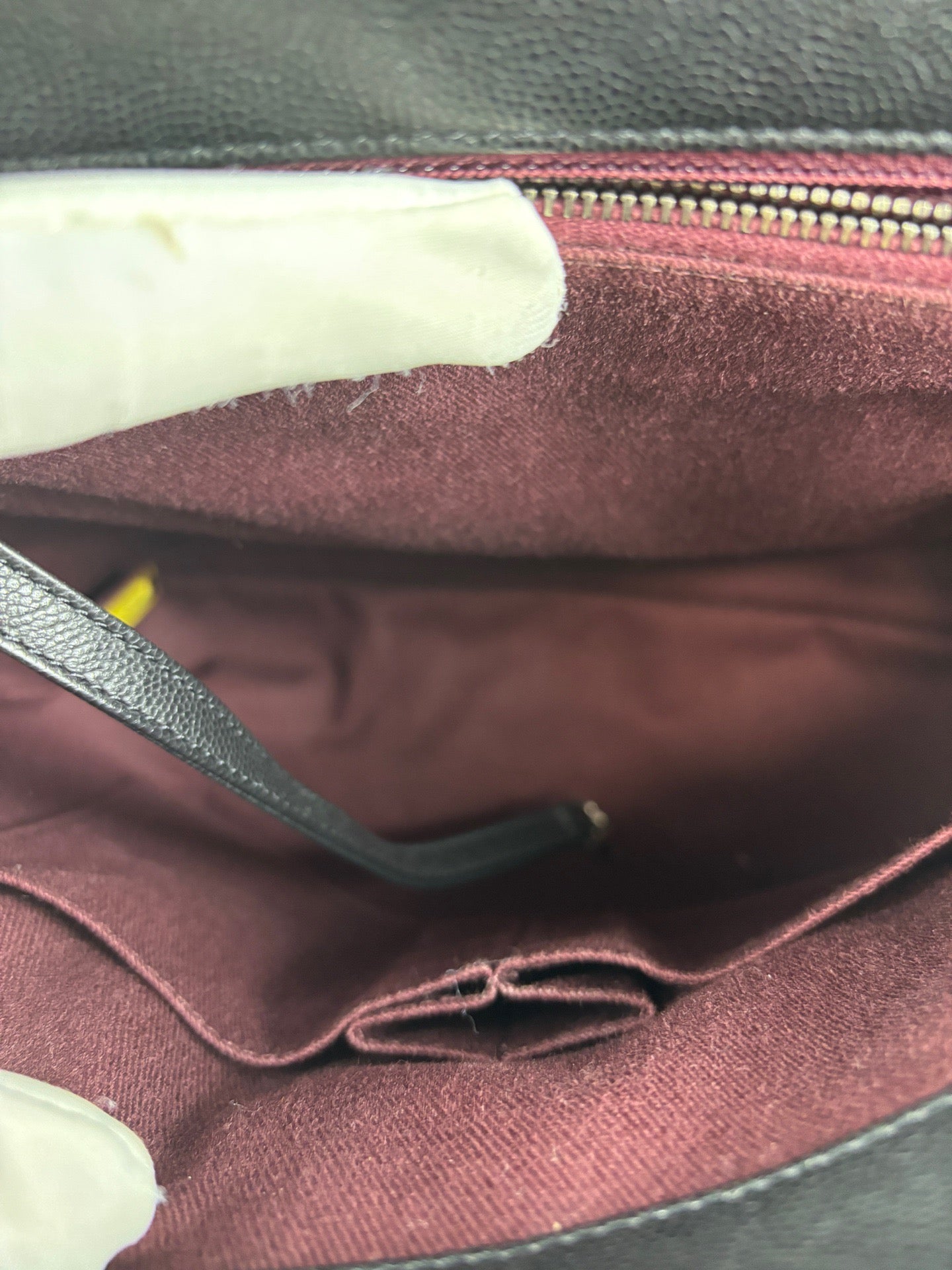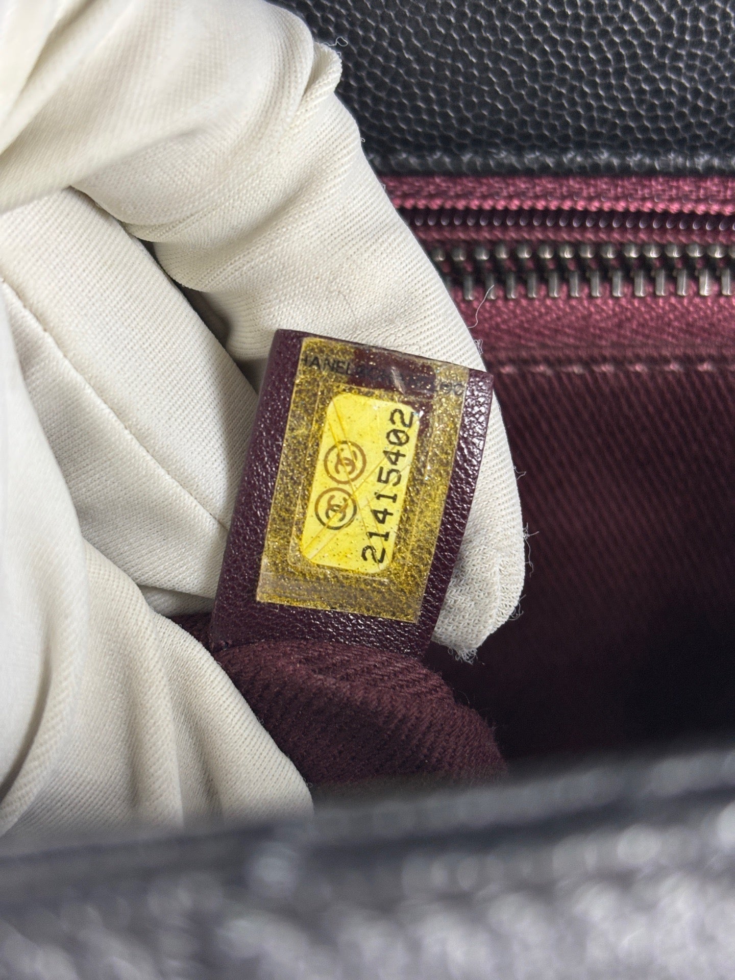 Adorned with silver-tone hardware, including the CC turn-lock closure on the front flap which functions smoothly. The chain strap, interwoven with matching black leather, is attached via silver-tone rings. Four protective feet studs are present on the base.