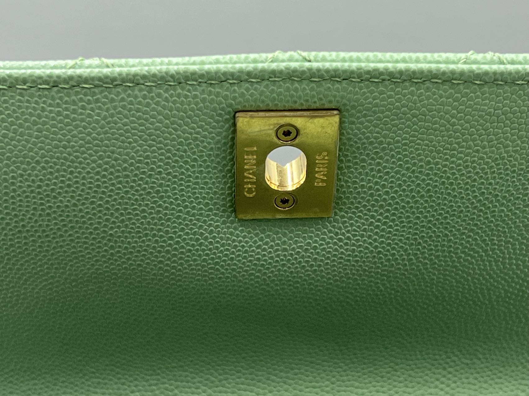 Crafted from durable grained calfskin leather, known for its resilience and structured texture, in a beautiful pastel green hue. The bag features Chanel's signature diamond quilting throughout the body and flap. A padded top handle allows for elegant hand carry, while a flat slip pocket is present on the back. Protective metal feet adorn the base.
