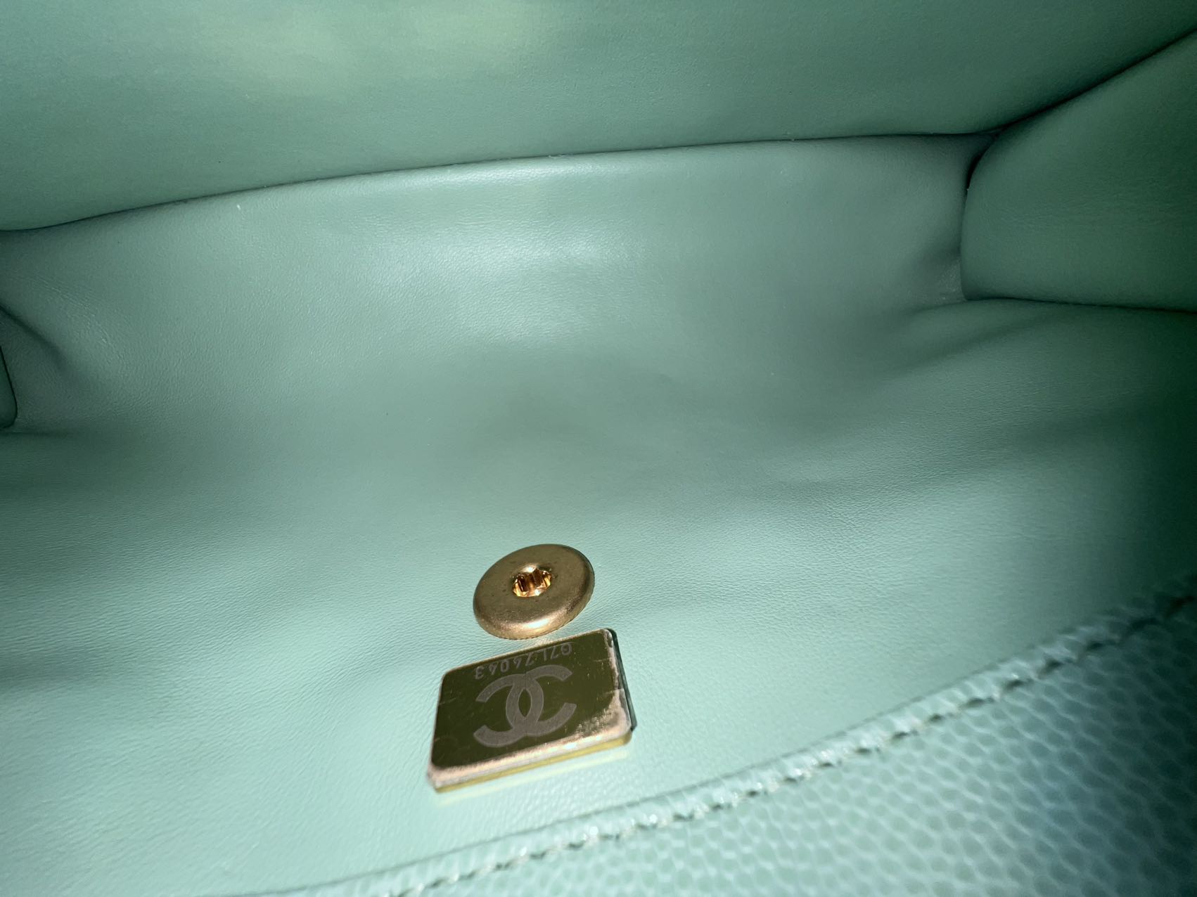 The interior is lined with matching smooth pastel green leather. It features a main compartment, typically with a zipped pocket on the underside of the flap and a slip pocket on the rear wall, offering practical organization. The 'CHANEL® MADE IN ITALY' hot stamp is clearly visible.