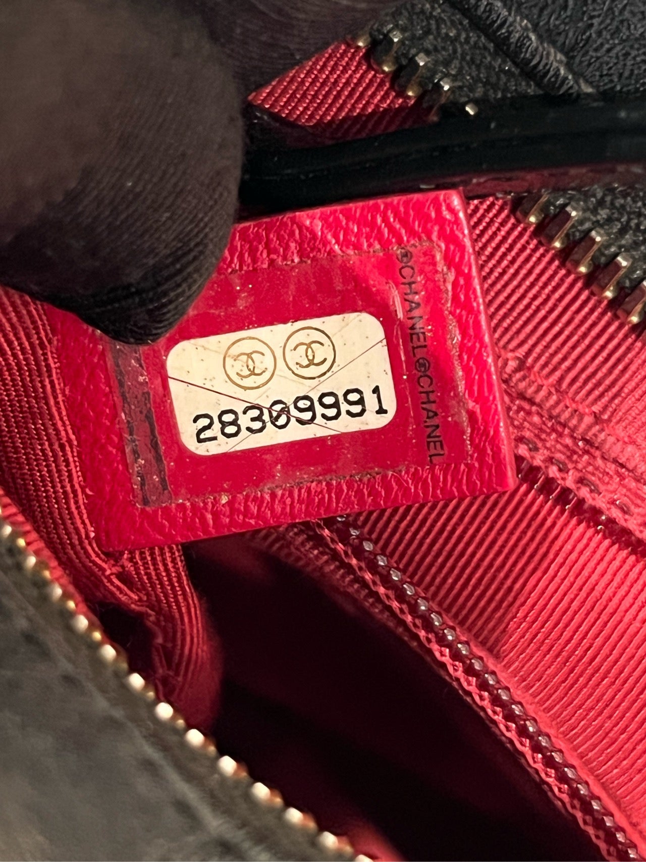 The interior is lined with a vibrant red grosgrain textile, providing a striking contrast to the black exterior. It is clean and well-maintained, featuring a main compartment and internal pockets for organization. A leather tag with 'CHANEL MADE IN ITALY' is prominently displayed, alongside the intact serial number sticker.