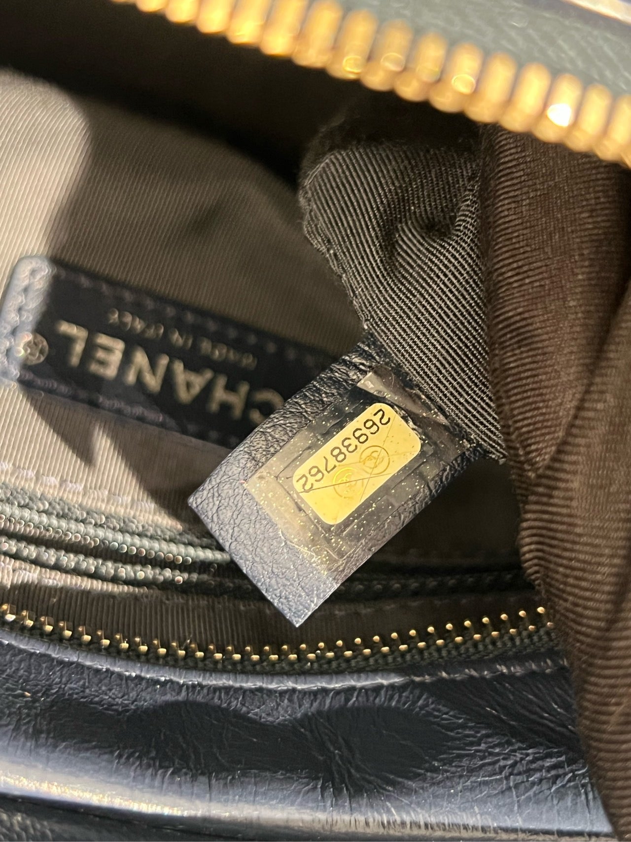 The interior is lined with a durable, dark textile material. It includes an authenticity sticker with the serial number and a 'CHANEL Made in Italy' leather plaque. The spacious compartment also features internal pockets, typical of the Gabrielle Hobo design, though specific pocket configurations are not fully visible.